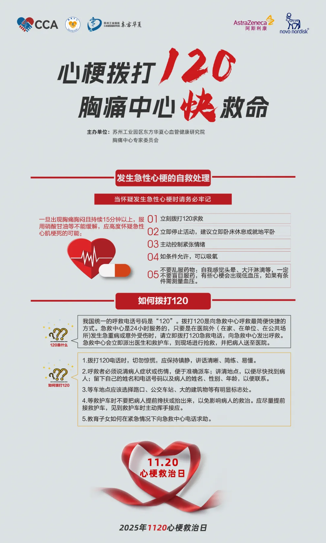 1120 寓意有两个:一是“有胸痛,我要拨打120”;二是“心梗救治,争取黄金120分钟”。作为国家胸痛中心示范基地,多年来,每年的11月20日,我院均组织相关的宣传活动,使公众认识急性心梗,了解急性心梗的危害,加强出现胸痛症状及时拨打120的意识。