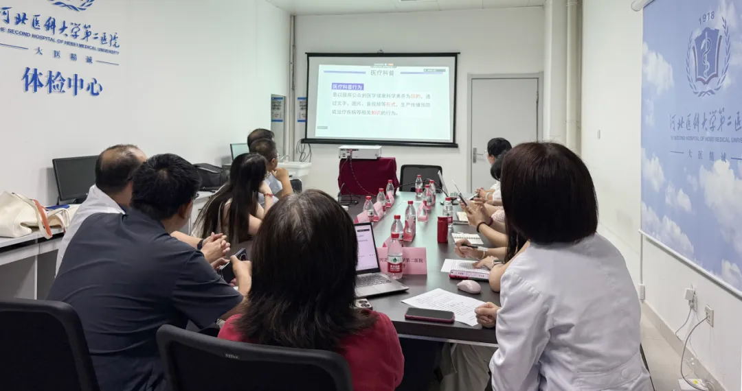 河北医科大学马克思主义学院张煊、河北政法职业学院司法实务系教学副主任张琳、河北冀华律师事务所高级合伙人张爱鑫、我院体检中心主任李峰、院志办主任兼宣传部副部长赵捷、健康管理部王倩和兄弟医院体检中心负责人共同参加了话题讨论。大家结合自身实际工作,就科普与咨询诊断、科普与广告、科普与患者宣教、科普与科研、科普与慢病管理、科普与廉洁从业、自媒体建设注意问题等方面提出了注意事项。