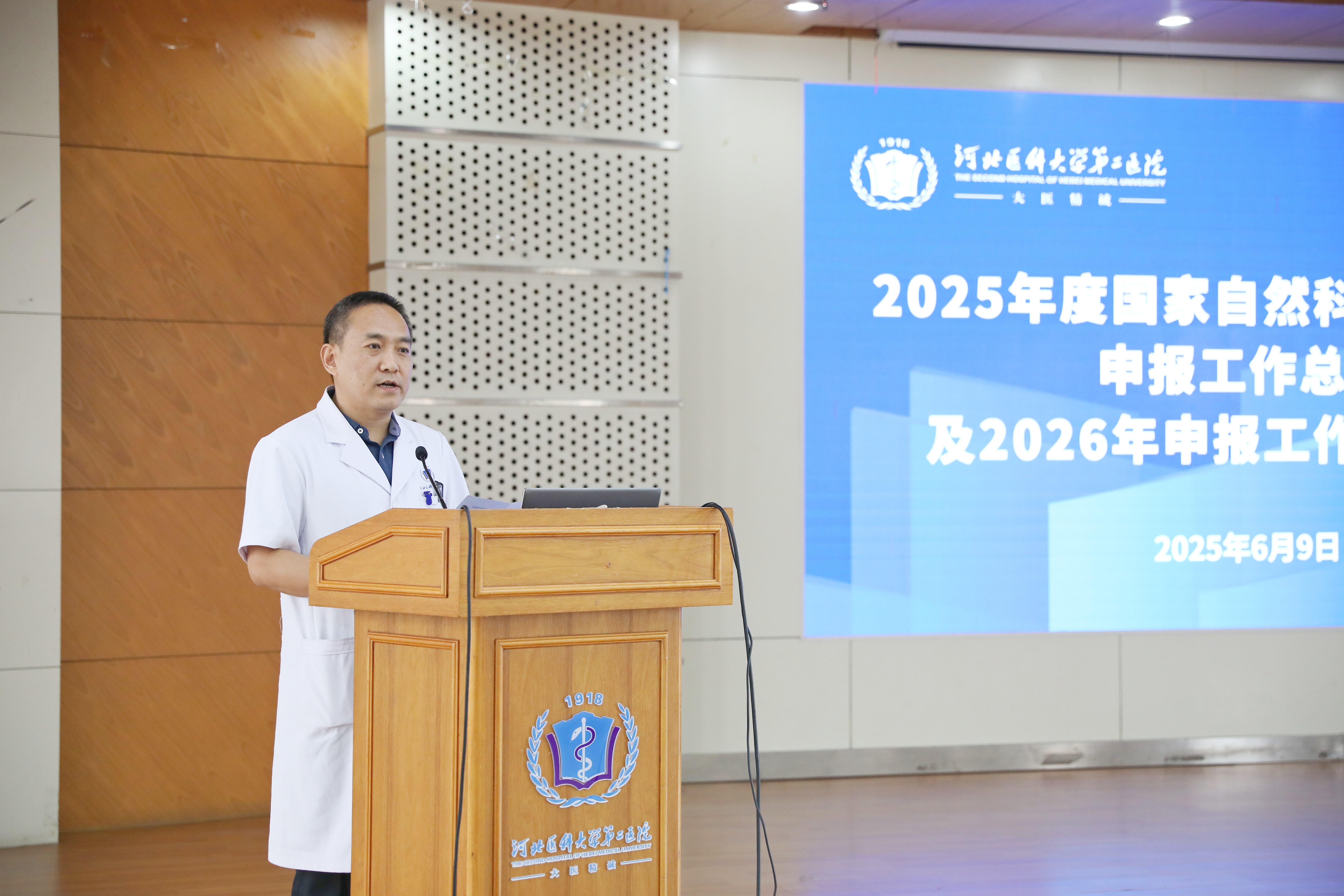 6月9日,我院召开2025年度国家自然科学基金项目申报工作总结及2026年度申报工作动员部署会,全体临床医技科室主任、博士生导师、40岁以下青年博士、国自然青年基金项目负责人、预申报国自然人员和专职科研人员参加会议。