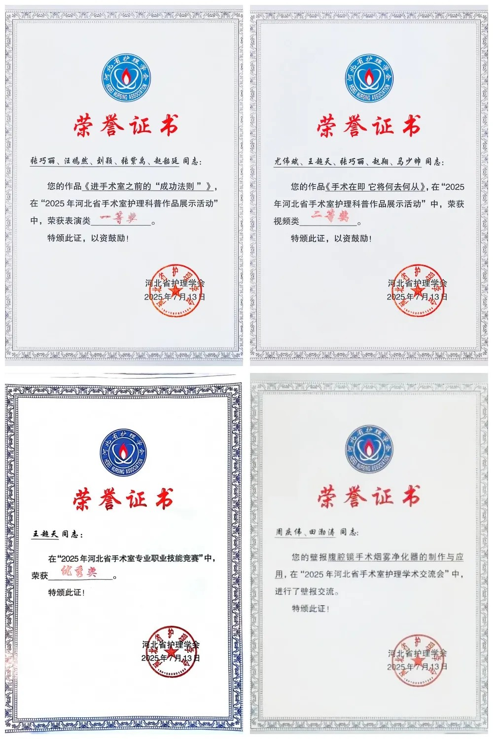 张巧丽、汪嫣然、刘颖、张紫禹、赵韶廷等医护人员带来的原创作品《进手术室前的成功法则》以生动有趣的表现形式、严谨科学的内容设计,荣获一等奖第一名,并作为优秀代表在大会现场进行展示;尤伟斌、王超天、张巧丽、赵翔、马少帅共同创作的视频作品《手术在即,它将何去何从》在“视频类科普作品”比赛中荣获二等奖,展现了该团队在医学科普传播中的创新实力;在职业技能竞赛中,王超天老师荣获优秀奖;周庆伟、田勃涛两位老师则通过壁报形式展示了论文《腹腔镜手术烟雾净化器的制作与应用》。