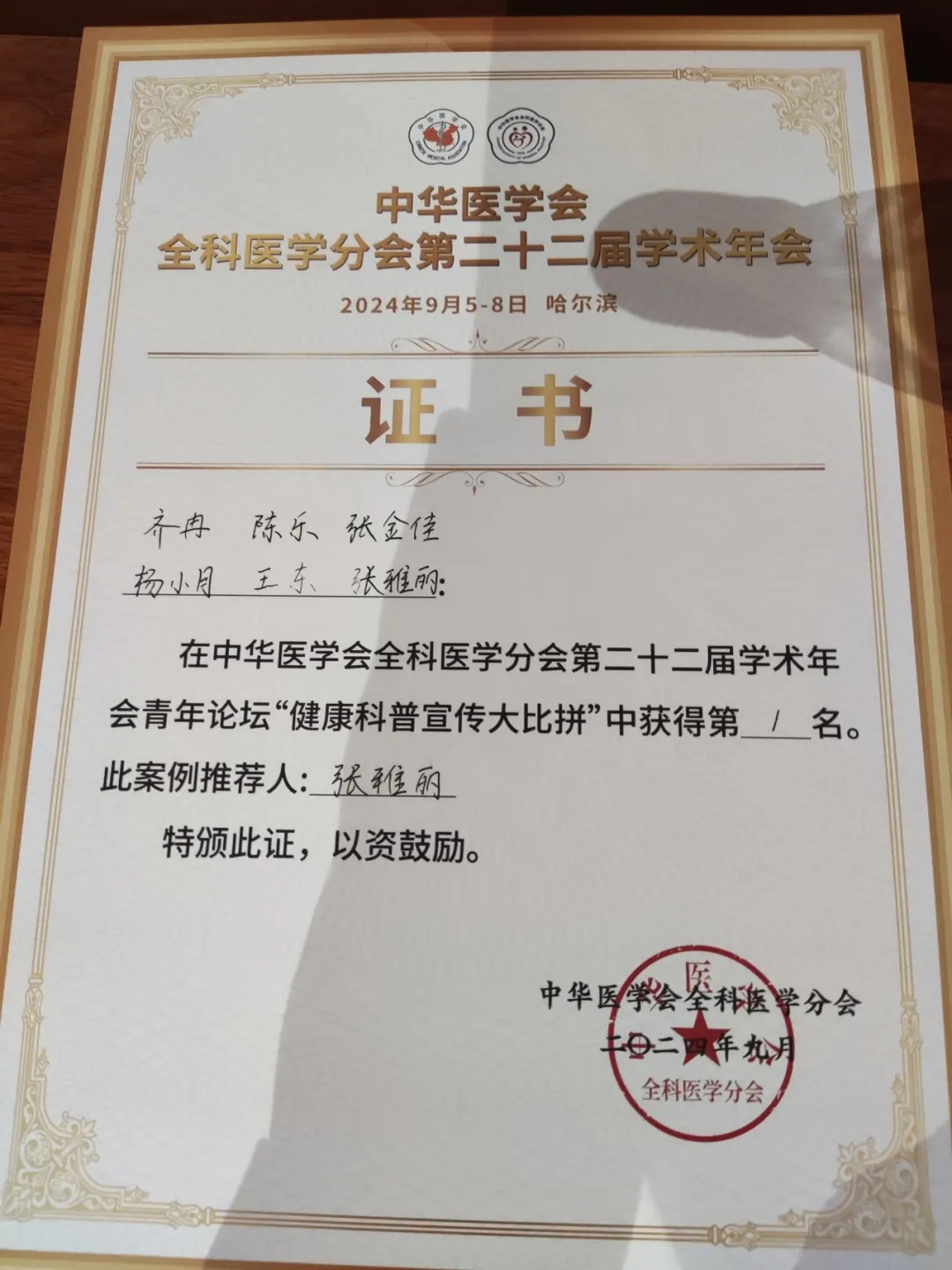 在近日举办的中华医学会全科医学分会第二十二届学术年会青年论坛分会场开展的“健康科普宣传大比拼”比赛中,经过激烈角逐,河北医大二院代表队脱颖而出,一举夺得全场第一名,展现了医院卓越的健康科普传播能力。