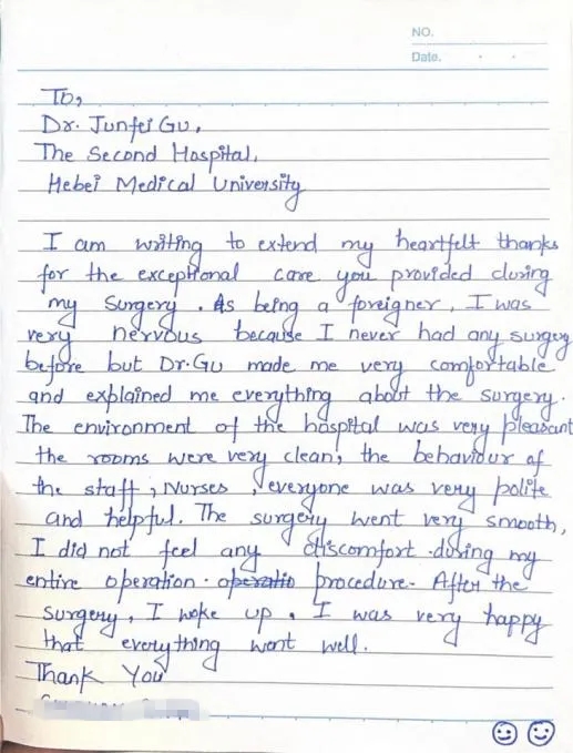 为了表达内心的感激之情,这位外籍留学生亲手写信致谢。他说:“感谢河北医科大学第二医院泌尿外科的全体医护人员,是你们的精湛医术和悉心照顾让我得以迅速康复。在这里,我感受到了温暖和关怀,你们的付出让我深受感动。”