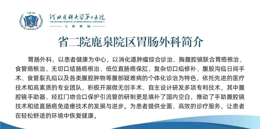 翠屏山下,龙泉湖畔,鹿泉院区胃肠外科成立以来,牢固树立以病人为中心的理念,紧跟国际医学前沿,在麻醉科、消化内科、ICU等科室的配合下,接连完成多台高难度手术,达芬奇机器人更是将胃肠外科手术带入“高精尖”的智能时代,为百姓就医提供了更优的保障。
