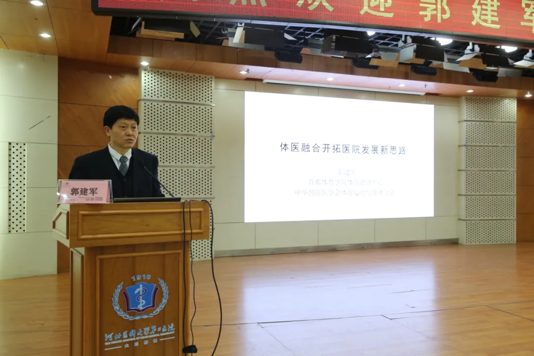 在随后开展的学术讲座中,郭建军教授以“体医融合开拓医院发展新思路”为题,系统介绍了体医融合概念,他指出,通过科学运动干预,可以有效预防和治疗慢性疾病,提升全民健康水平。讲座为我院在健康促进领域的工作提供了宝贵的参考。院领导、各科室主任、护士长及医护骨干200余人聆听讲座。