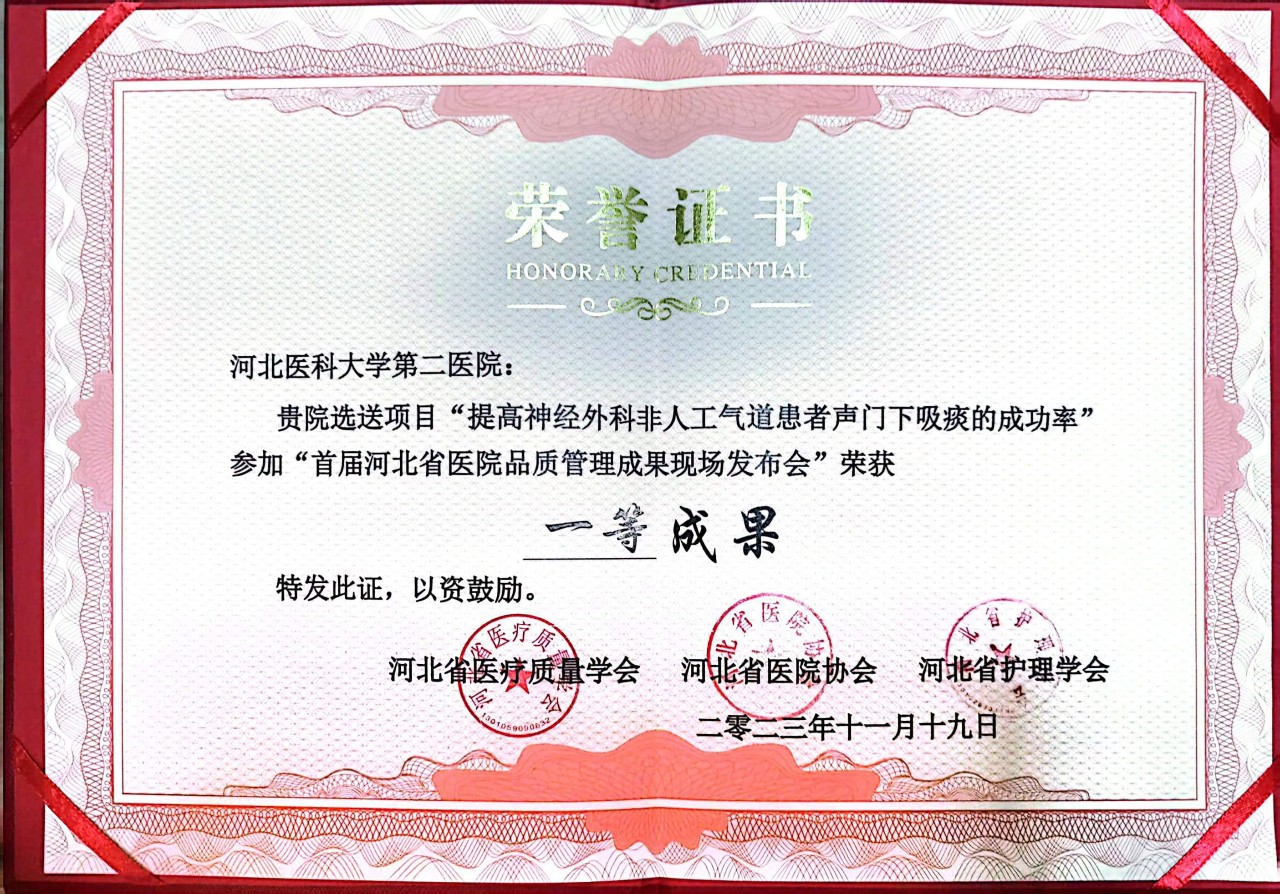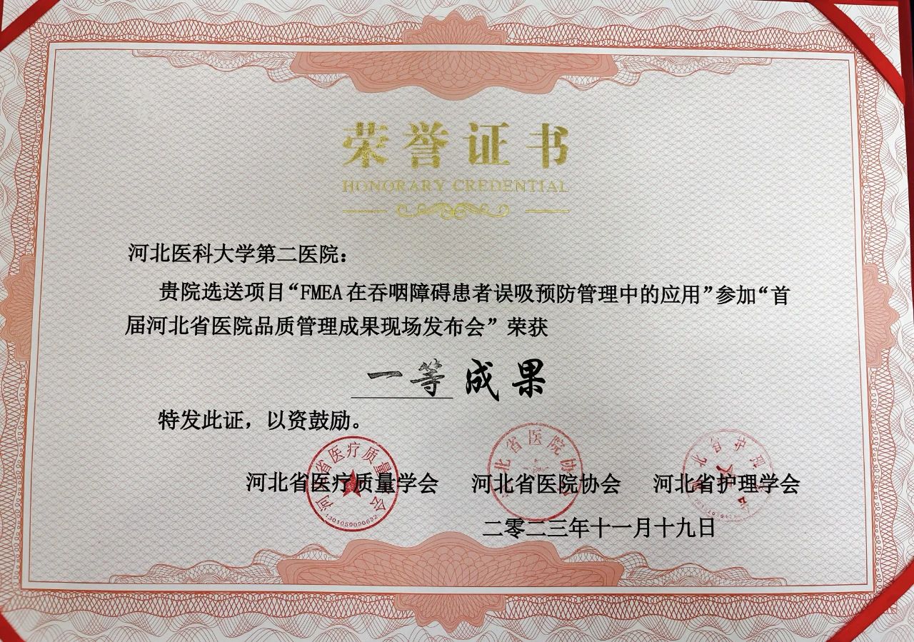 “首届河北省医院品质管理成果大赛”由河北省医疗质量学会、河北省医院协会、河北省护理学会联合举办,来自全省各级各类医疗机构共申报400多个项目参赛,经过专家初评,192个项目进入复赛。复赛中,我院神经外科“护航圈”参赛作品“提高神经外科非人工气道患者声门下吸痰的成功率”和神经内科护理团队参赛作品“FMEA在吞咽障碍患者误吸预防管理中的应用”脱颖而出,喜获一等奖;重症医学科护理团队参赛作品“FMEA联合PDCA在ICU经口气管插管医护配合中的应用”荣获二等奖。