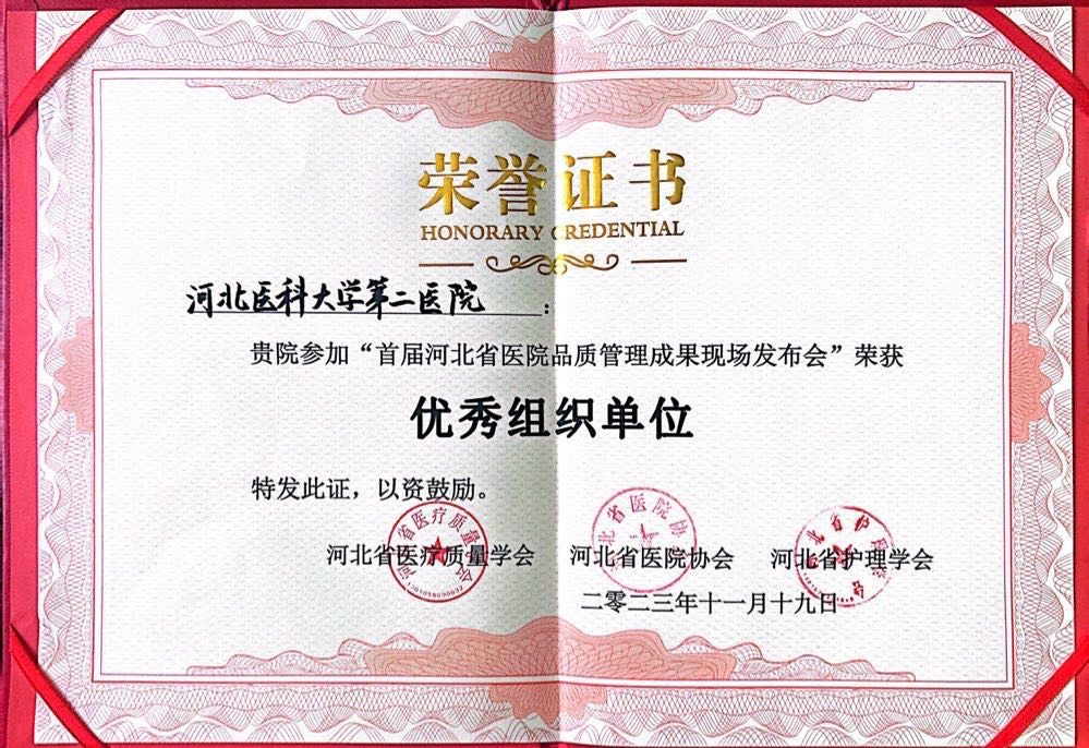 在日前举办的“首届河北省医院品质管理成果大赛”上,经过激烈角逐,我院护理部选送的3个参赛作品荣获一等奖2项,二等奖1项,我院荣获“优秀组织单位”奖。