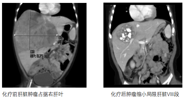 患儿当时不到7个月,而肝脏肿瘤几乎占据整个右半肝脏,为提高患儿生存率及生活质量,李索林教授团队为其制定术前新辅助化疗,化疗后影响评估能否肝切除术。经过4个疗程规范性化疗后,再次进行影像学检查显示患儿肝脏肿瘤明显缩小,且肿瘤局限在肝脏VIII段位置。