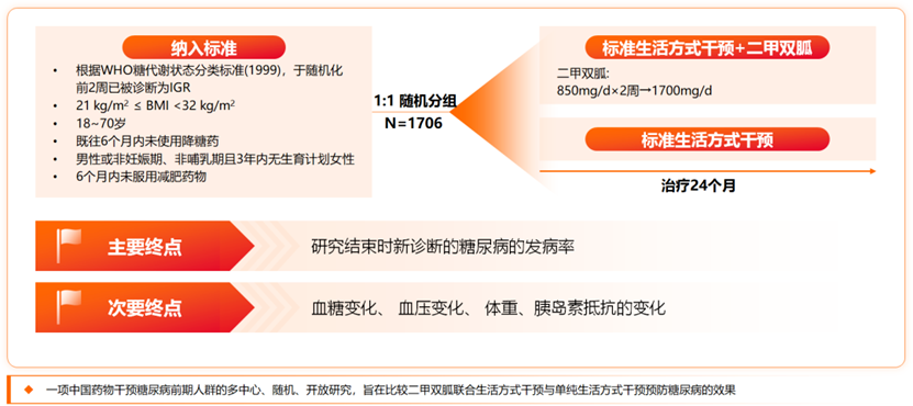 在李光伟教授和张力辉教授的牵头组织下,来自北京、河北、上海、天津、黑龙江、吉林、辽宁、山西、浙江、江西、四川、广东12个省市的42个团队密切合作,共纳入43家医院1706例成人糖尿病前期受试者,以1:1比例予以标准生活方式干预或标准生活方式干预+二甲双胍治疗24个月,并根据血压、降压药物使用和糖耐量进行分层随机。主要终点为研究结束时新诊断糖尿病的发病率,次要终点包括不同代谢指标的变化。结果显示:生活方式干预组和二甲双胍+生活方式干预组的糖尿病发病率分别为19.83例/100人-年和17.27例/100人-年;与单纯生活方式干预相比,二甲双胍+生活方式干预显著降低糖尿病发生风险达17%。治疗24个月时,与单纯生活方式干预相比,二甲双胍+生活方式干预显著降低糖尿病前期人群的体重(-1.16 kg vs. -2.11 kg,P=0.0002)和BMI(-0.43 kg/m^2 vs. -0.76 kg/m^2,P=0.0003)。二甲双胍+生活方式干预治疗24个月还可改善糖尿病前期人群的胰岛素敏感性和早相胰岛素分泌指数(提示β细胞功能得到改善)。