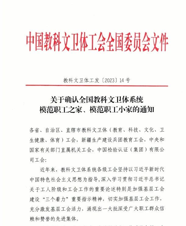 近日,我院工会被中国教科文卫体工会全国委员会授予“模范职工之家”荣誉称号,这是全面评价工会工作的综合奖项,也是教科文卫体系统的最高荣誉。