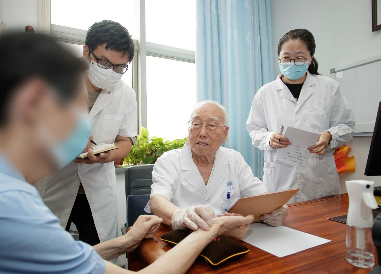 在诊室中,已经94岁高龄的国医大师姚希贤教授依然一丝不苟的在为患者诊病,姚教授的这种敬业精神使所有在场的师生倍感崇敬、备受激励。王贵英书记对姚教授多年来为医院发展所做出的贡献表示衷心的感谢,并认真征求他对医院发展的意见和建议,还叮嘱各部门要切实照顾好姚教授的工作和生活。姚希贤教授精神矍铄的表示:“奋楫笃行践初心,探医学文化奥秘、拓中国医学春秋,我将继续为国家培养人才,为传承发展中医学而努力。”