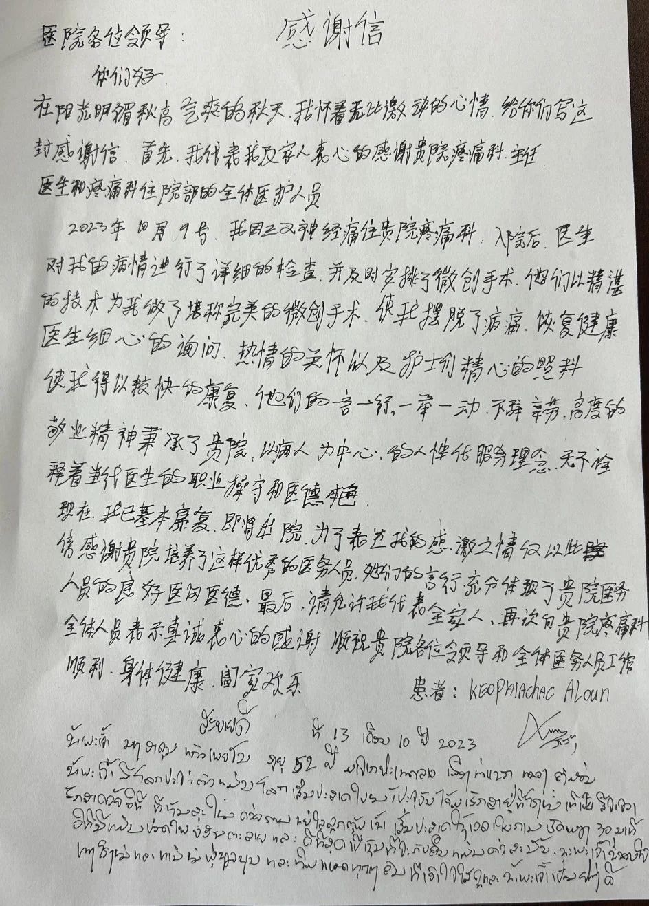 近日,一位被顽固性三叉神经痛困扰折磨十余年的老挝患者阿伦女士(化名)在我院成功治愈。出院时,阿伦女士一家人双手合十,连连致谢,并写下情真意切的感谢信。
