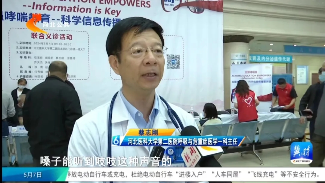 世界哮喘日当天,呼吸与危重症医学一科阎锡新、蔡志刚,耳鼻咽喉一科任秀敏、儿科徐青等15名医护人员组成的义诊团队,耐心细致的为患者讲解哮喘诊断预防治疗及自我管理等医学知识,免费发放哮喘防治手册,促进患者全面了解哮喘疾病相关知识。义诊现场,蔡志刚教授接受了河北电视台采访,介绍了“正确认识哮喘,科学预防对症治疗”的健康知识。