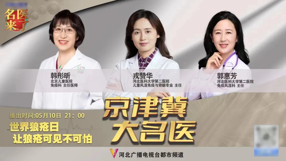 当天晚上21:00,北京儿童医院免疫科韩彤昕教授、我院风湿免疫科郭惠芳教授、我院儿童肾脏及风湿免疫专业戎赞华教授应邀参加了河北广播电视台《名医来了》节目,让SLE患者足不出户,享受国内一流专家的的直播诊疗服务。