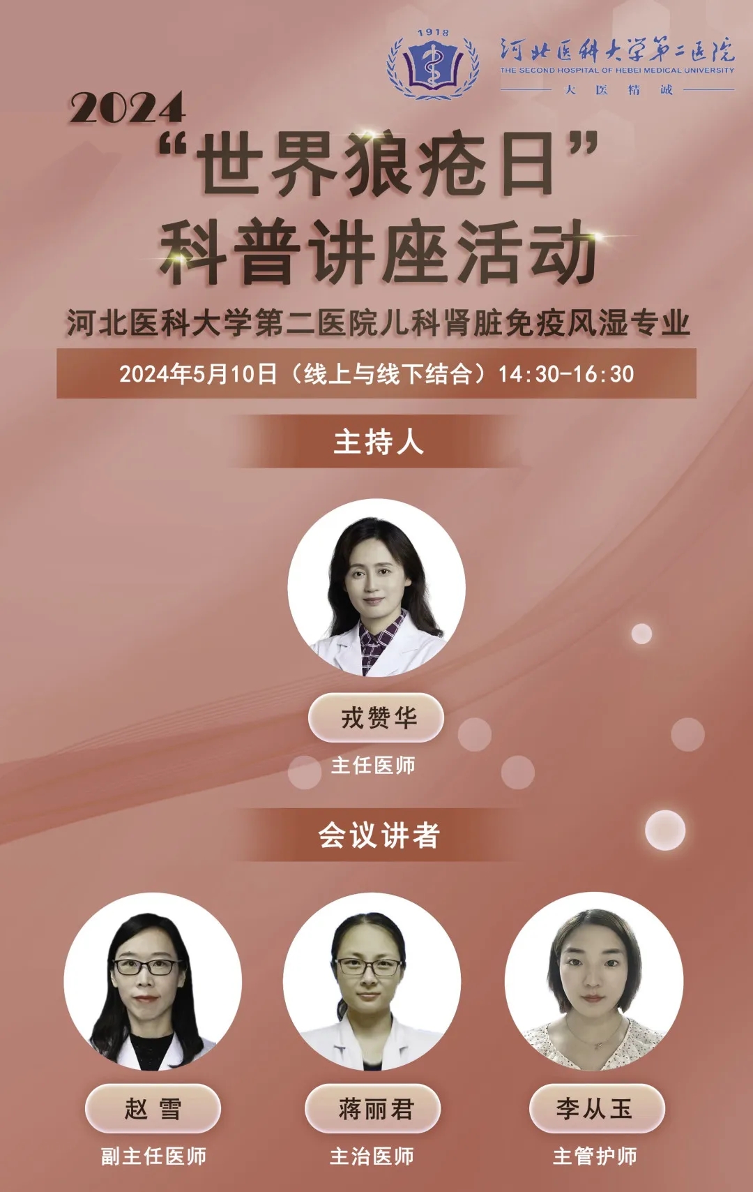 当天下午,我院儿童肾脏及风湿免疫专业在北院区以线下结合线上的形式举办了“世界狼疮日”科普讲座活动。