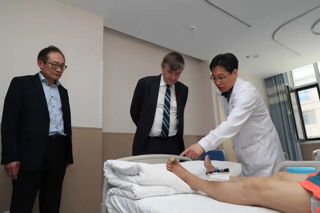 在鹿泉院区骨科病房,宋永周教授对我院骨关节炎病人的外科阶梯治疗经验进行了介绍,并针对我院骨科应用胫骨横向骨搬移结合抗生素骨水泥对复杂难治性糖尿病足进行外科综合处理的经验与外宾进行了分享与交流。