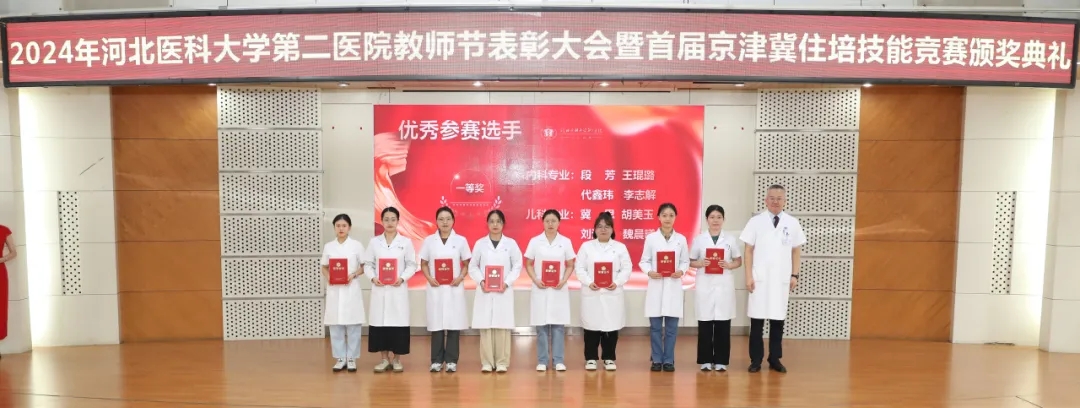 近年来,医院在教育教学及住院医师规范化培训方面取得了优异成绩。在首届京津冀住培技能大赛中,我院从 54 支京津冀高水平参赛队伍中脱颖而出,荣获了6个专业一等奖中的两项,2个专业为命题专业,是继河北省住培技能大赛三连冠后的又一佳绩,充分展示了医院深厚的学术底蕴和敢为人先的精神风貌。