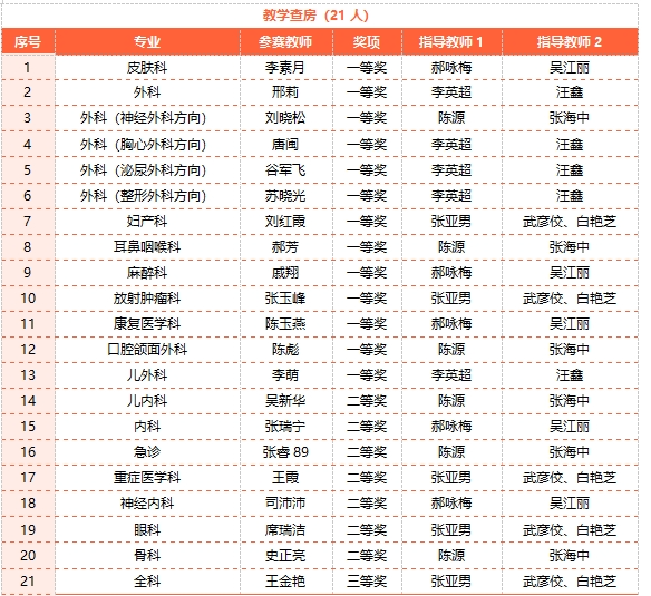 单项比赛中,我院教学查房项目赢得13个一等奖,7个二等奖,1个三等奖;全科教学门诊项目赢得一等奖;小讲课项目赢得11个一等奖,11个二等奖,7个三等奖。我院51个参赛项目100%获奖,其中10个专业揽获教学查房和小讲课双项目一等奖!