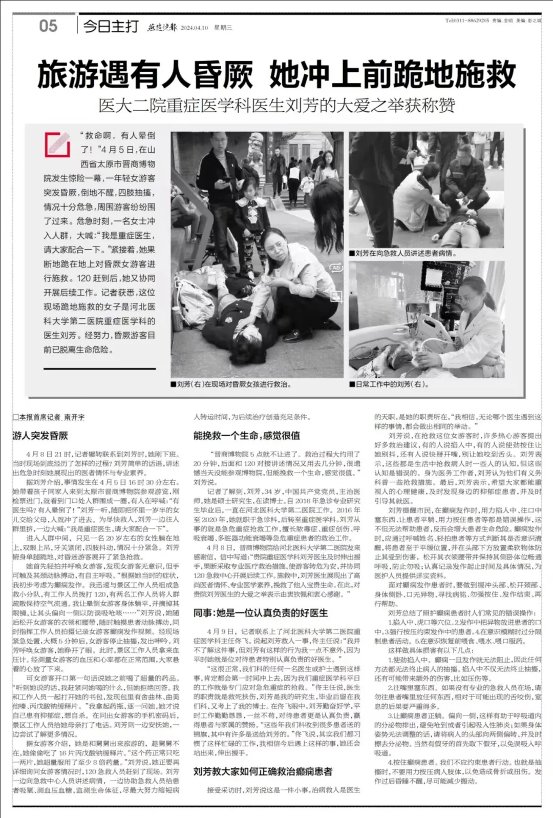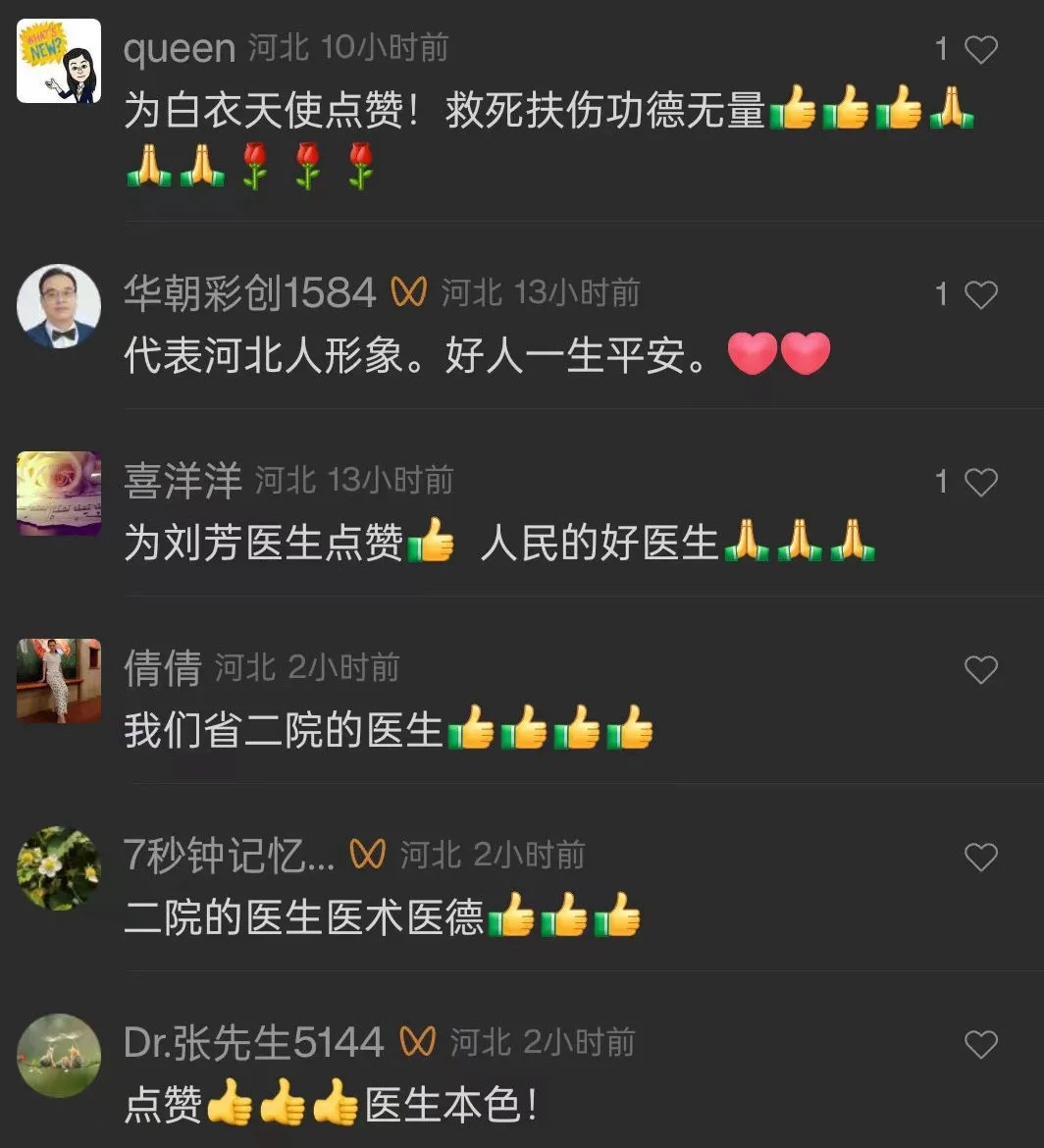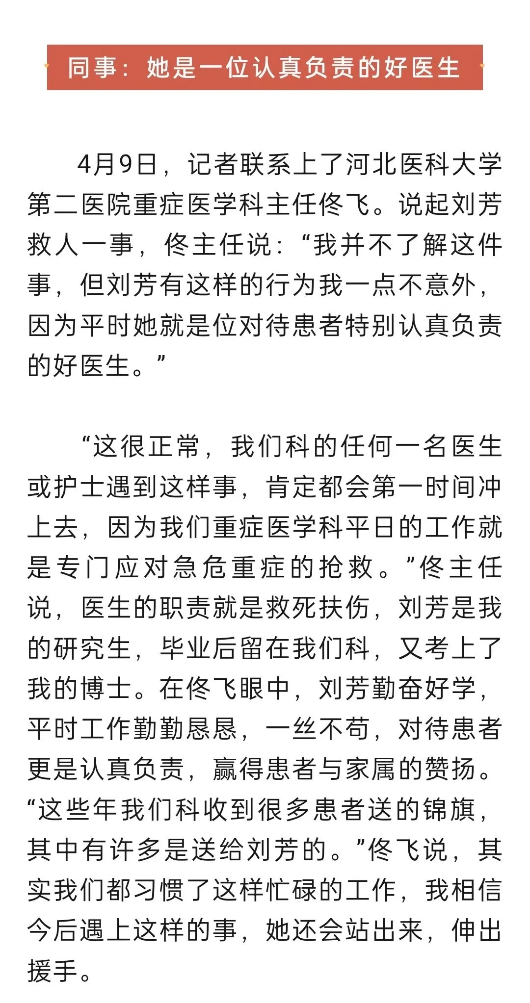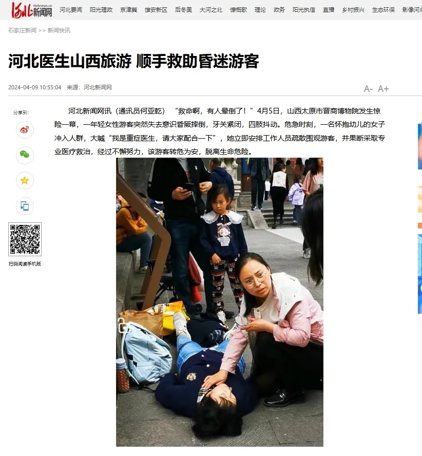 ——清明假期期间,我院重症医学科医生刘芳,在偶遇游客突发疾病时及时救助,帮助游客转危为安。她挺身而出的担当精神、训练有素的职业素养和高超精湛的医疗技能,获得广泛好评,中国交通广播、河北新闻网、燕赵晚报、石家庄新闻网等多家媒体对刘芳的事迹进行了报道。面对赞誉,她只是表示,“救人,是医生的本能。”