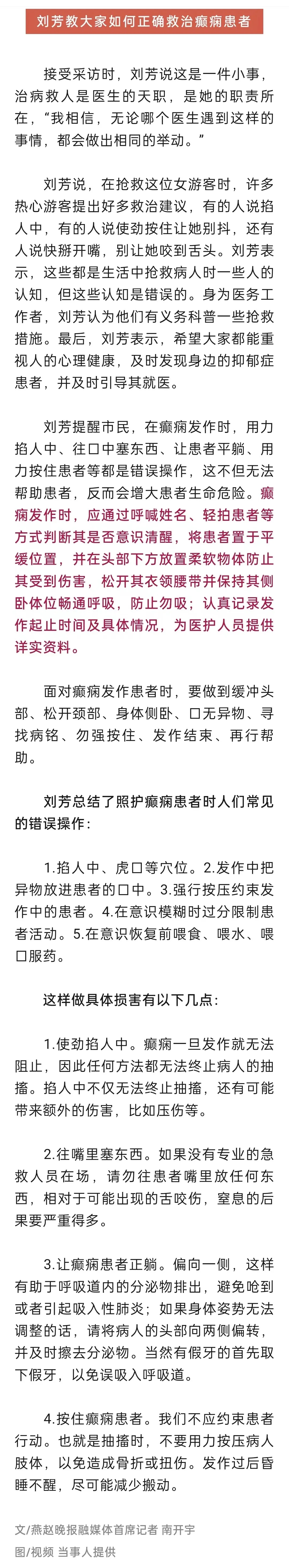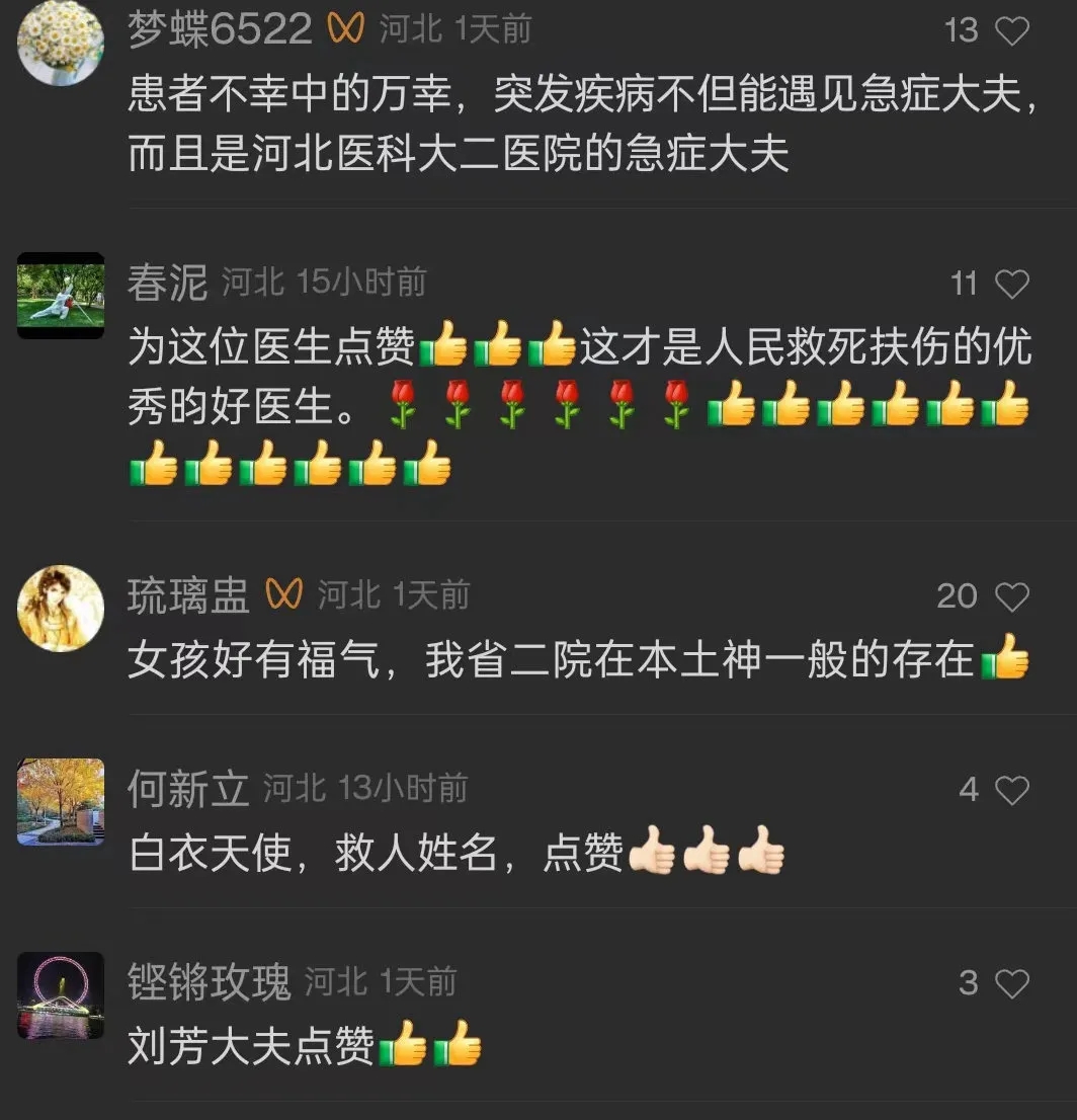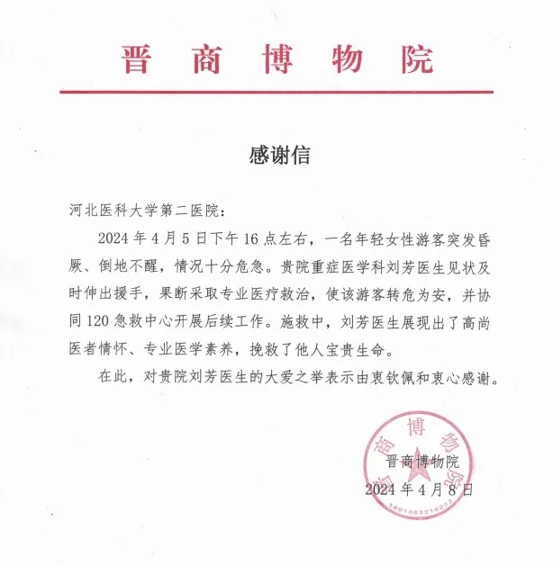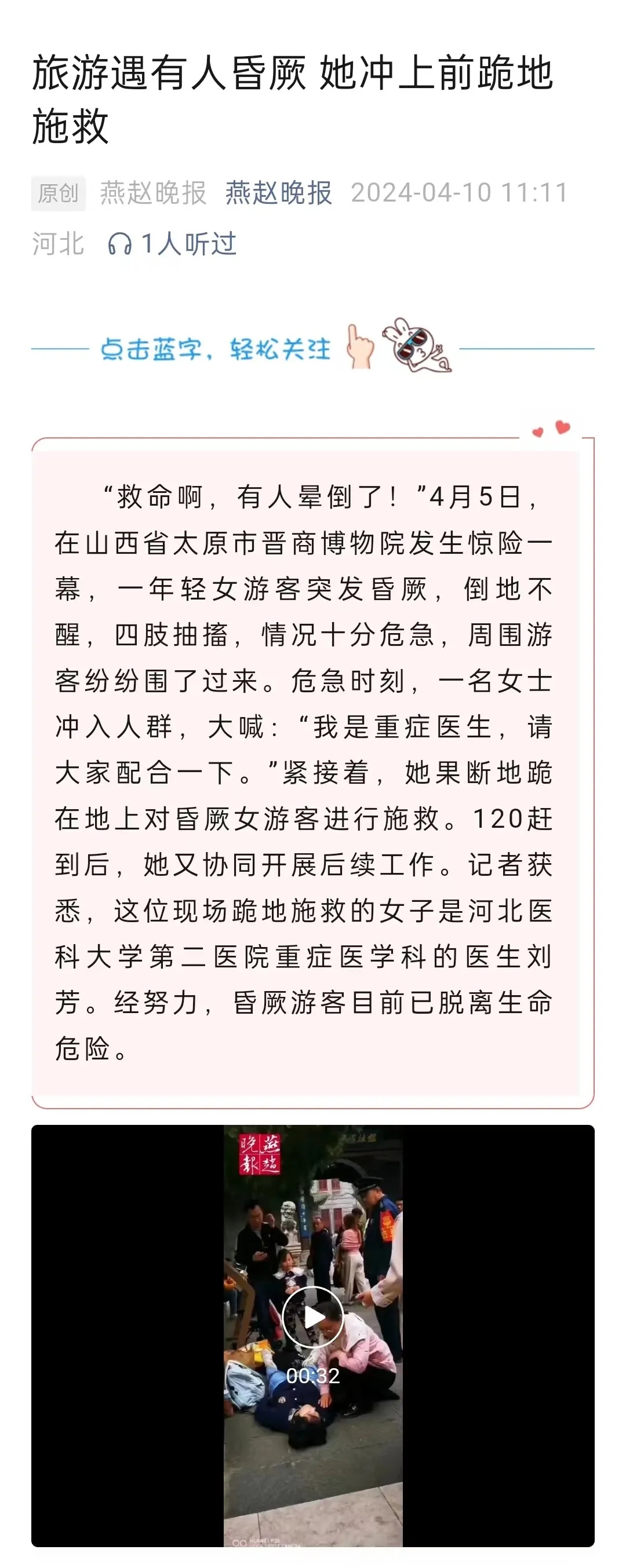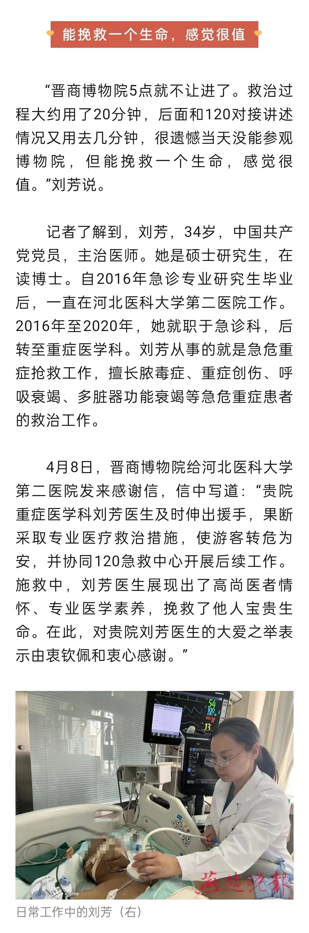 ——清明假期期间,我院重症医学科医生刘芳,在偶遇游客突发疾病时及时救助,帮助游客转危为安。她挺身而出的担当精神、训练有素的职业素养和高超精湛的医疗技能,获得广泛好评,中国交通广播、河北新闻网、燕赵晚报、石家庄新闻网等多家媒体对刘芳的事迹进行了报道。面对赞誉,她只是表示,“救人,是医生的本能。”