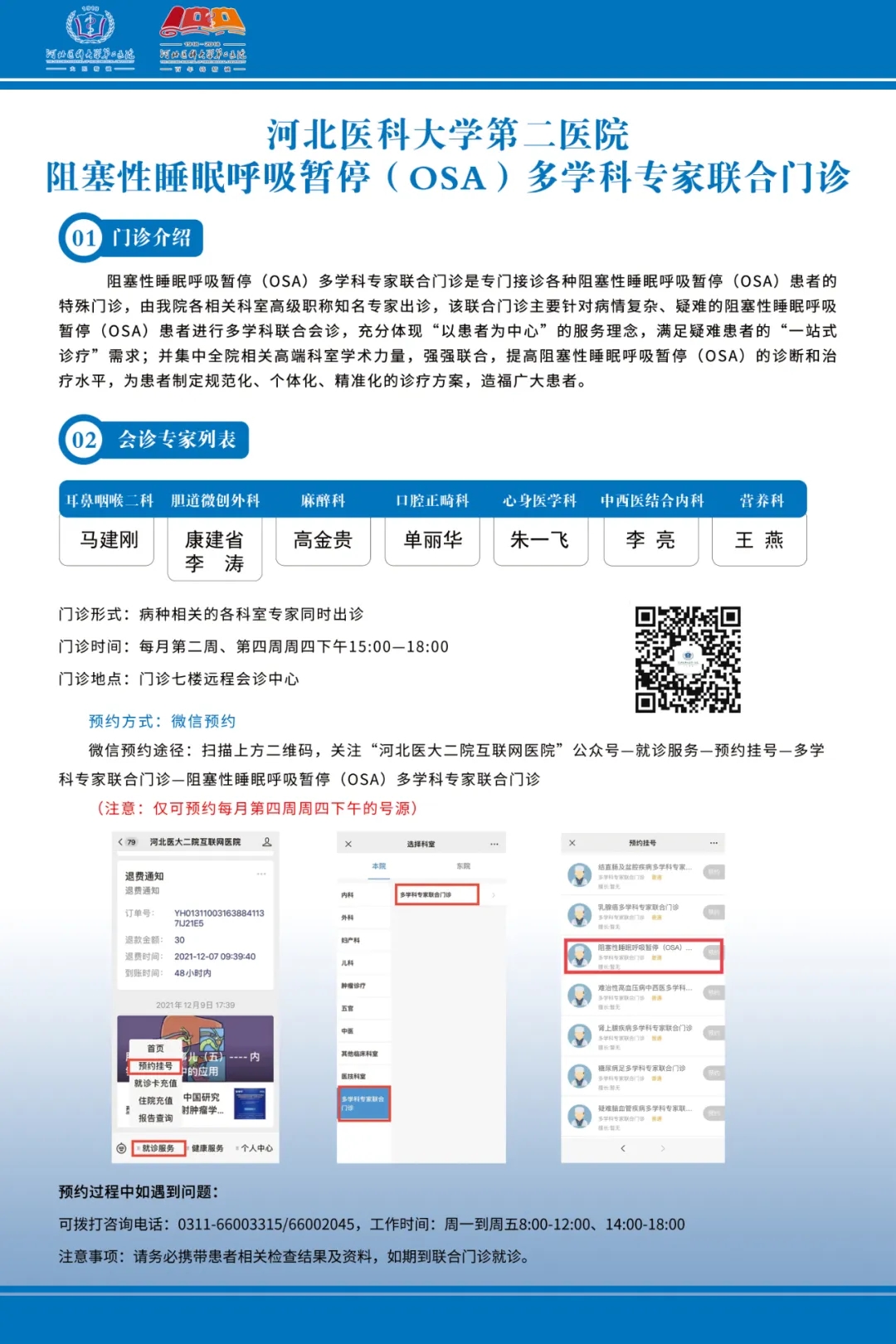 耳鼻喉二科马建刚教授介绍,我院阻塞性睡眠呼吸暂停(OSA)多学科专家联合门诊,由我院各相关科室高级职称知名专家出诊,该联合门诊主要针对病情复杂、疑难的OSA患者进行多学科联合会诊,充分体现“以患者为中心”的服务理念,满足疑难患者的“一站式诊疗”需求;并集中全院相关高端科室学术力量,强强联合,努力提高OSA的诊断和治疗水平。