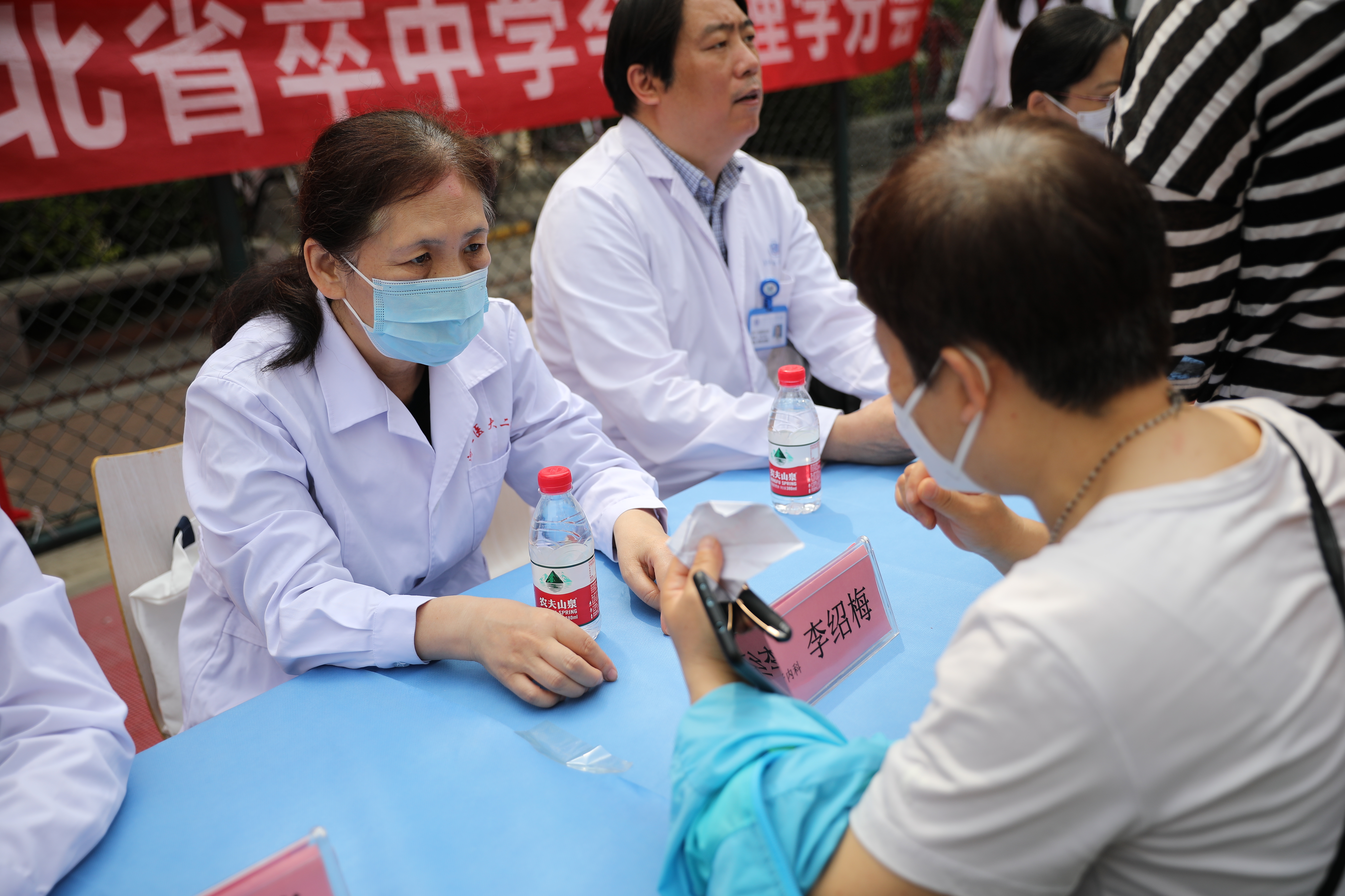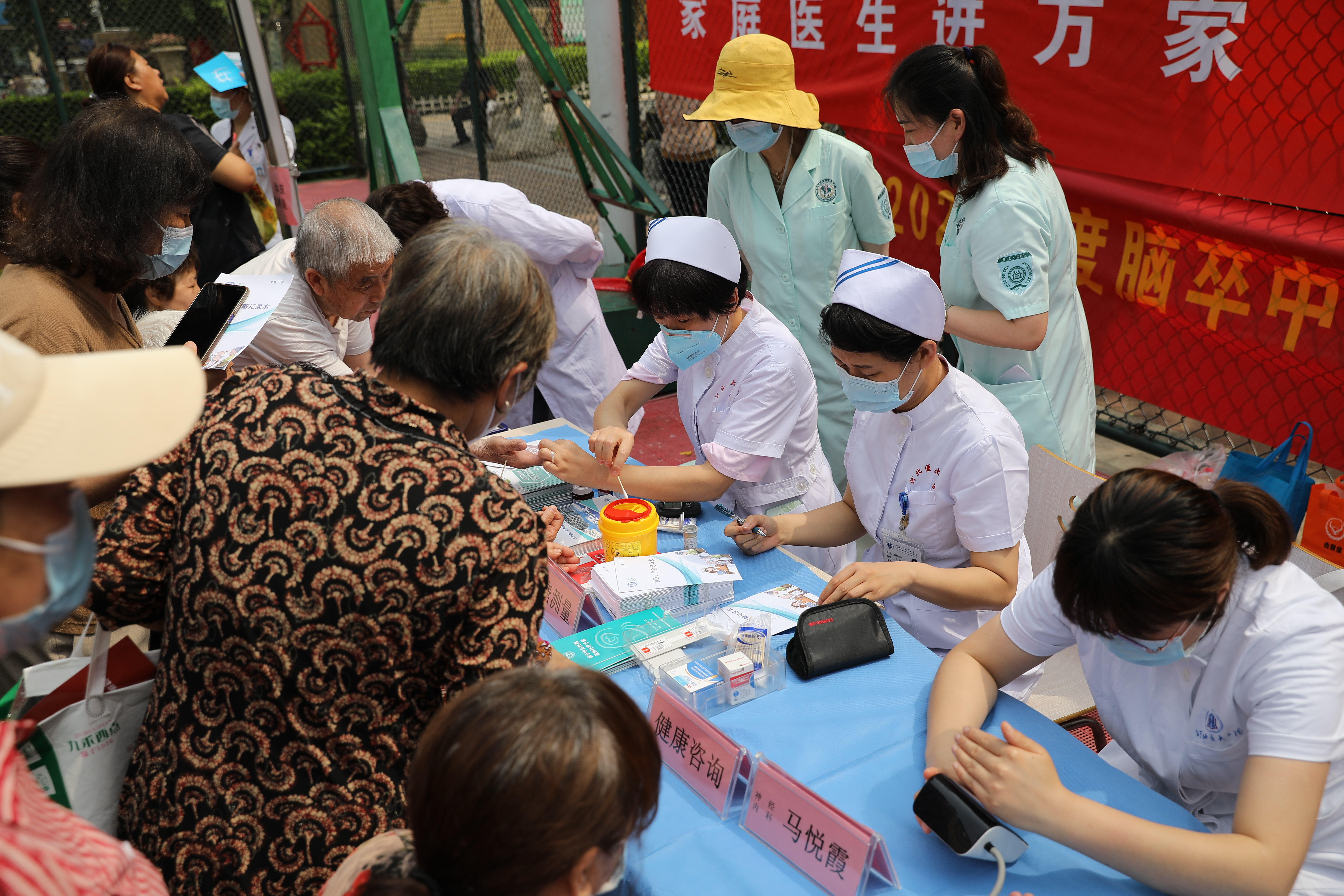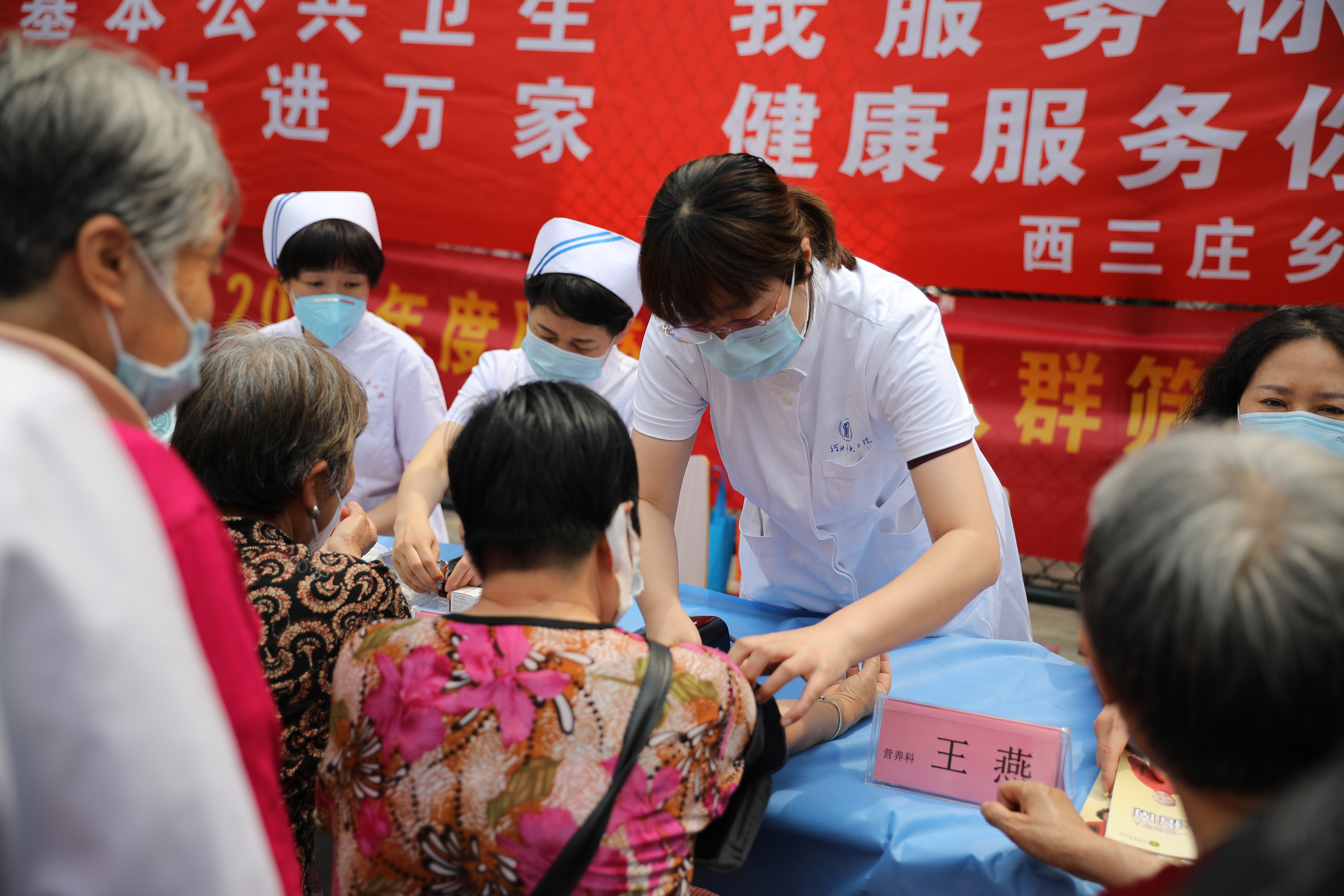 在烈日之下的义诊现场,我院肾内科李绍梅、针灸科卜彤文、内分泌内科王瑞英、心内七科都虹、神经内科甄军丽、耳鼻喉二科蒋新霞、营养科王燕、北院区神经内科马悦霞等医护专家对前来咨询的居民进行了详细的解答和耐心的指导,为他们提供了专业的医疗建议和治疗方案。同时结合发放慢病防治相关宣传资料,实践演示等方式,分享了一些高血压的测量、如何合理饮食、关注自身情绪等小贴士。