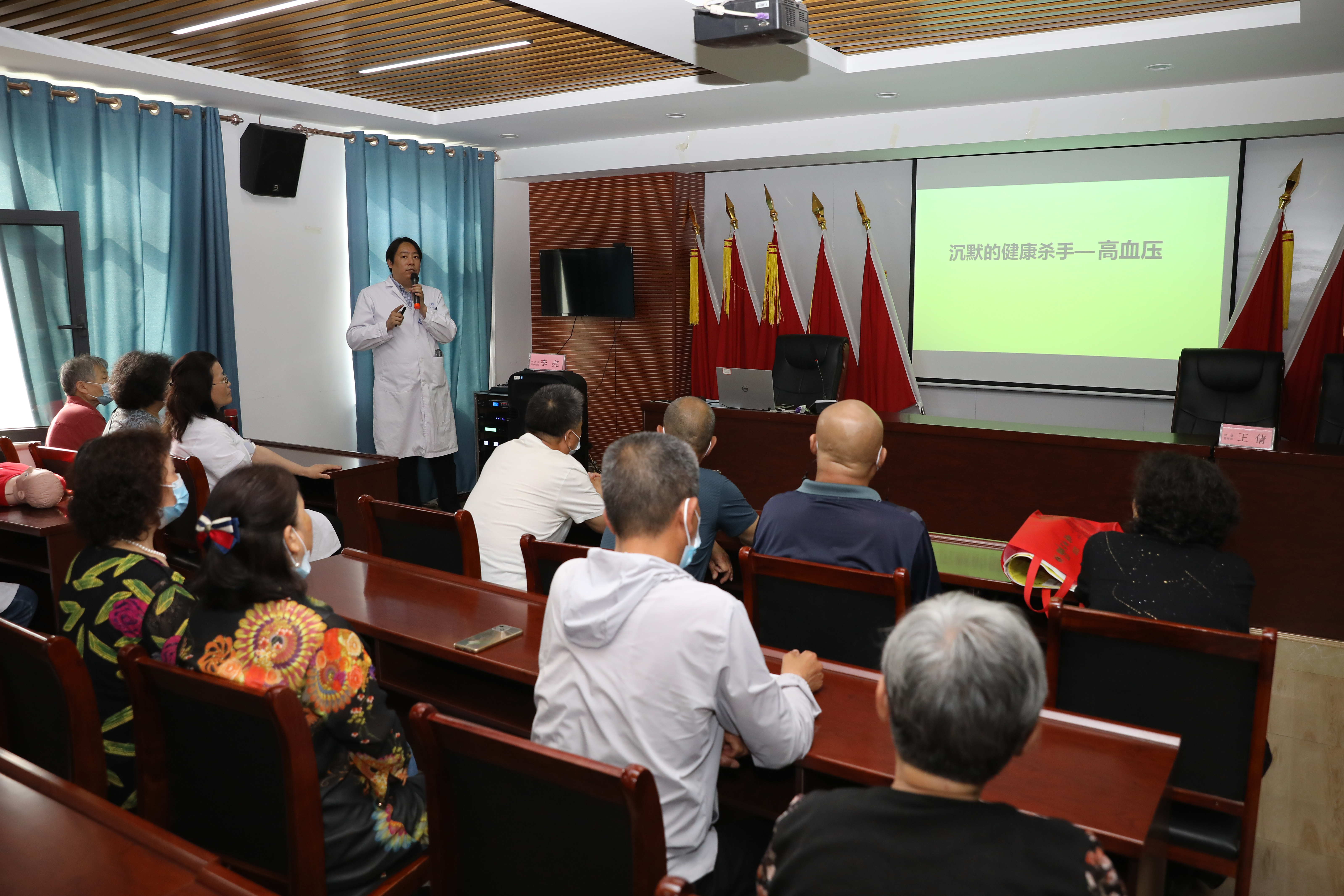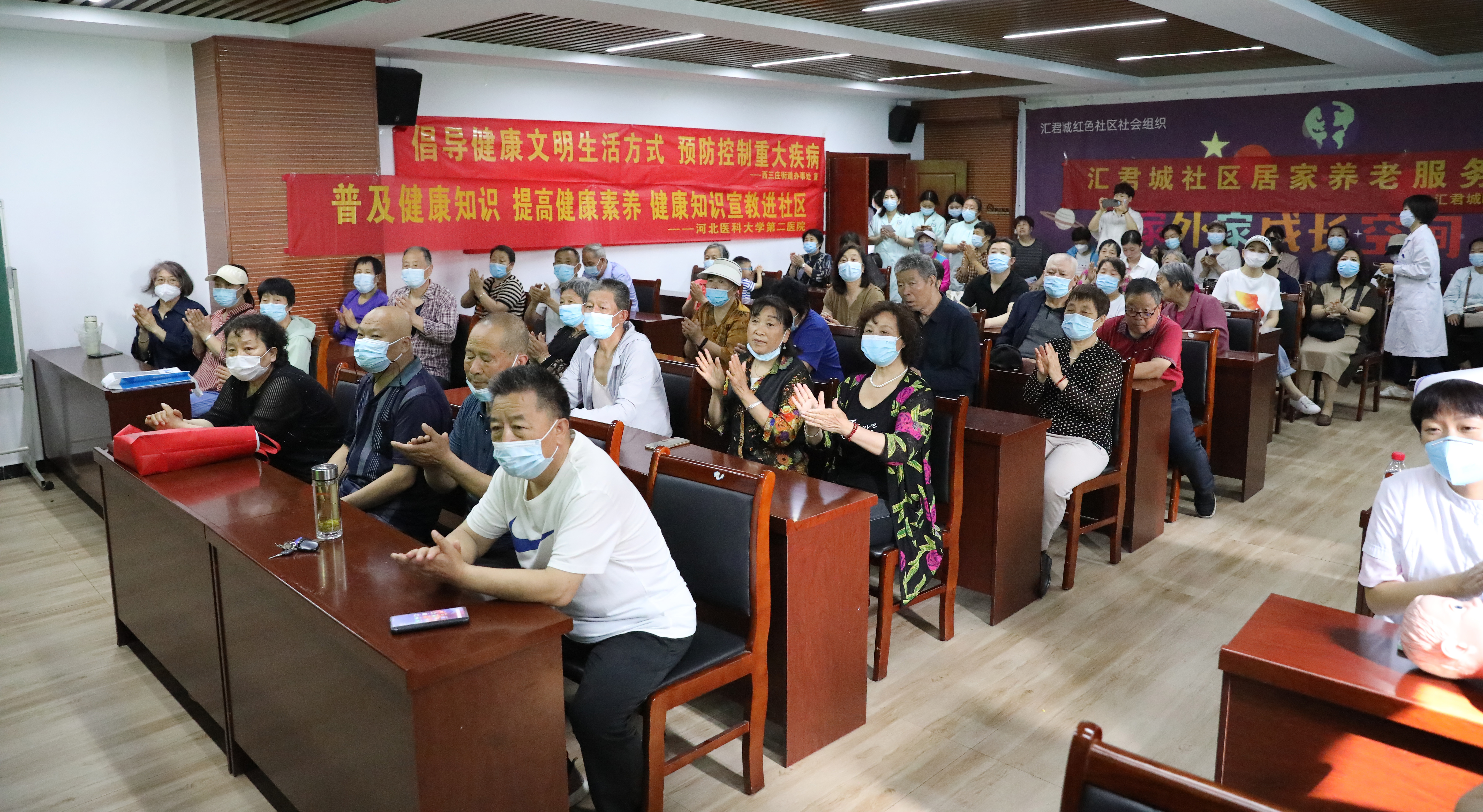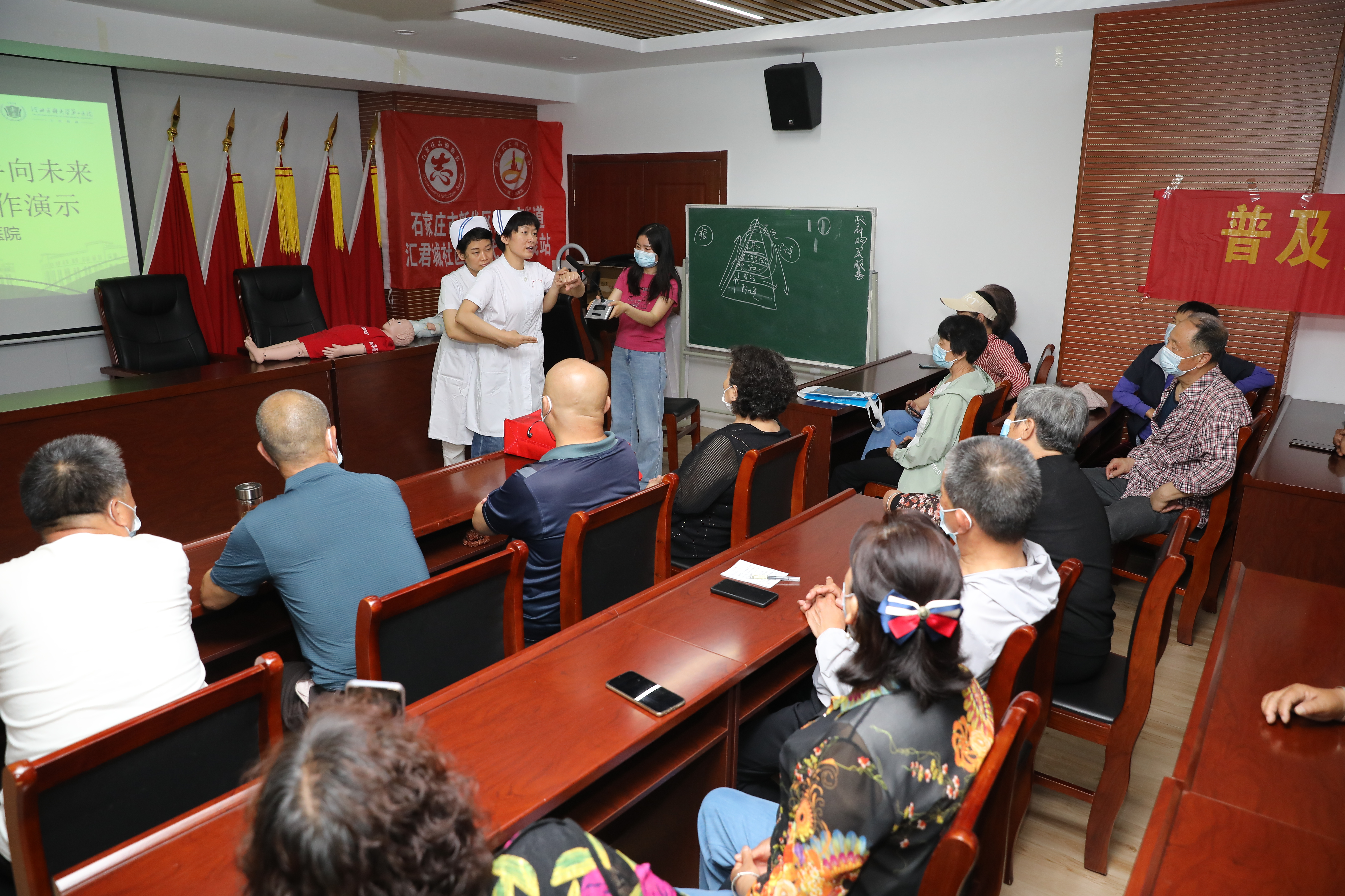 在汇君城社区群众活动中心,中西医结合内科李亮围绕高血压日主题开展了科普讲座。他用浅显易懂的语言,对高血压定义、危险因素,如何预防,怎样正确服用降压药物,家庭精准监测血压的要求和意义等方面进行了讲解。此外,根据医院健康管理部前期健康科普需求调研,我院脑心健康管理师王帅、刘新卫通过“真人表演”形式向居民生动展示了海姆立克急救法的正确操作,提高了居民的生活急救小常识。