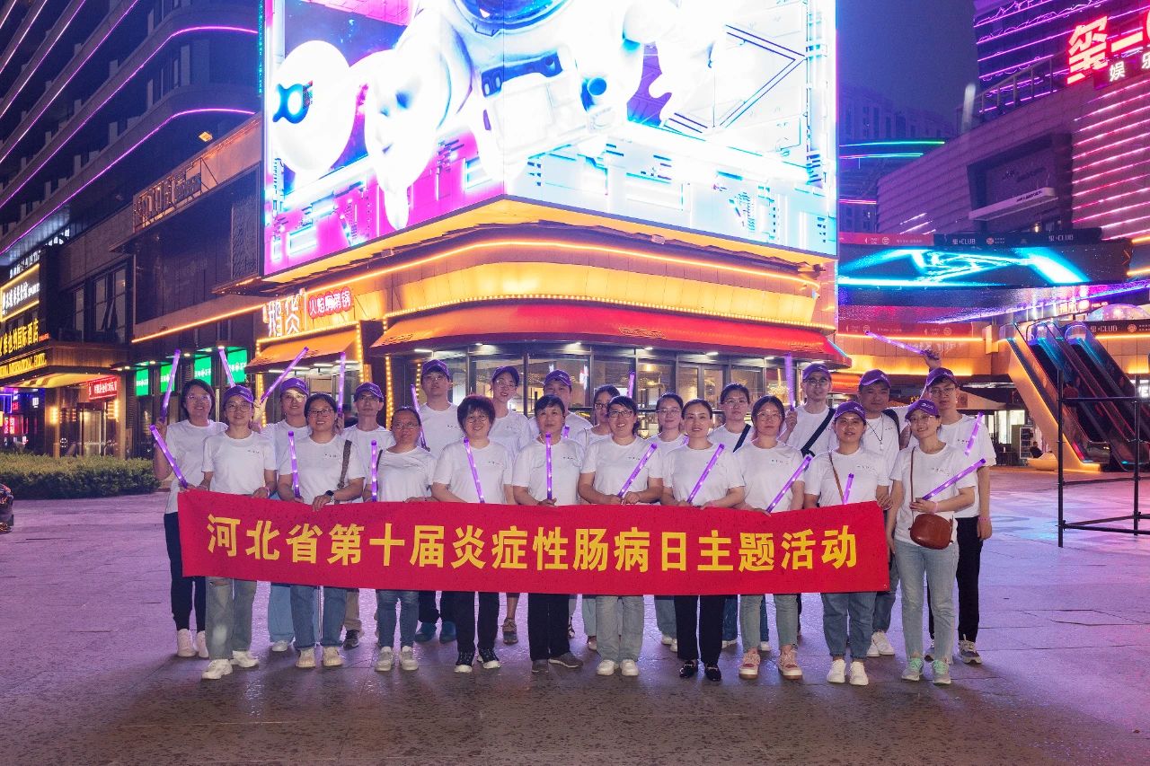 5月16日17:00,东院区消化内科医护人员与IBD患者开启健康骑行,大家身着带有世界炎症性肠病日logo和医院院标的白色T恤,头戴紫色宣传帽,30人的骑行队伍从我院东院区出发到达目的地中冶盛世广场,齐聚在广场写字楼下共同见证了大厦点亮“5.19世界炎症性肠病日——河北在行动”的宣传标语紫色灯光。紫色是世界炎症性肠病日的颜色,瞬间光所照亮的地方都变成了紫色,引来了众人的驻足观看。本次骑行也受到了众多媒体的关注,东院区消化内科主任张晓岚在现场接受了媒体采访。