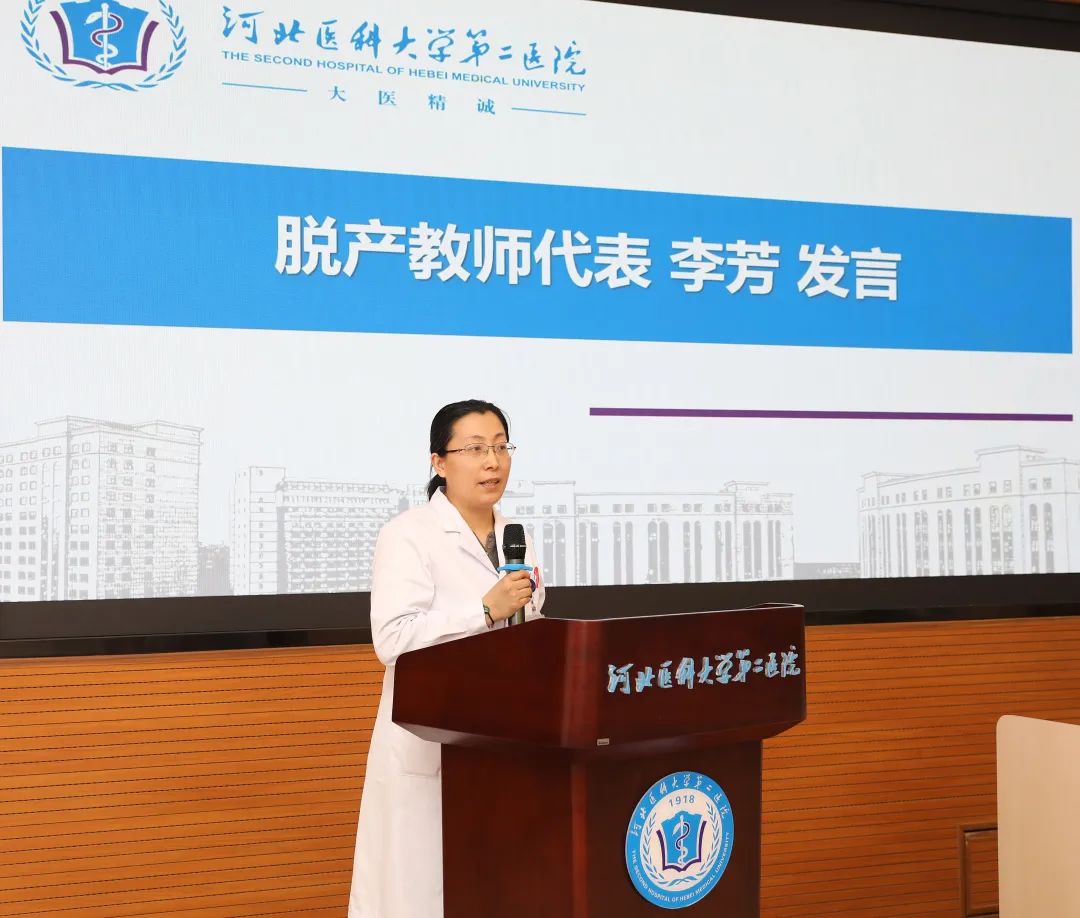 内科学教研室李芳老师代表脱产教师发言。她结合其自身成长经历与多年临床的所见所闻,鼓励同学们要努力学习、奋发向上,追随前辈培养医德、扎根实践、打磨医术。希望同学们在老师们倾尽所学的保驾护航下,乘着二院的大船扬帆远航。
