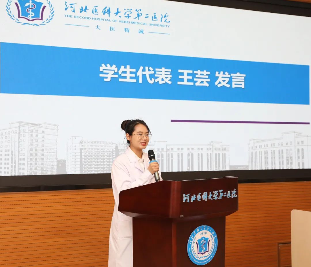 学生代表王芸同学分享了从学校到医院这一转变过程中的所想所思。离开象牙塔,穿上白大褂,作为“2.5+2.5”学制改革的第一批学生,同学们将珍惜更早接触临床的机会,夯实基础,提高技能,敢于冲锋,不断进取,传承百年二院“大医精诚”的精神,跟上一代代二院人在提高人民群众身体健康水平的道路上奋斗的脚步!