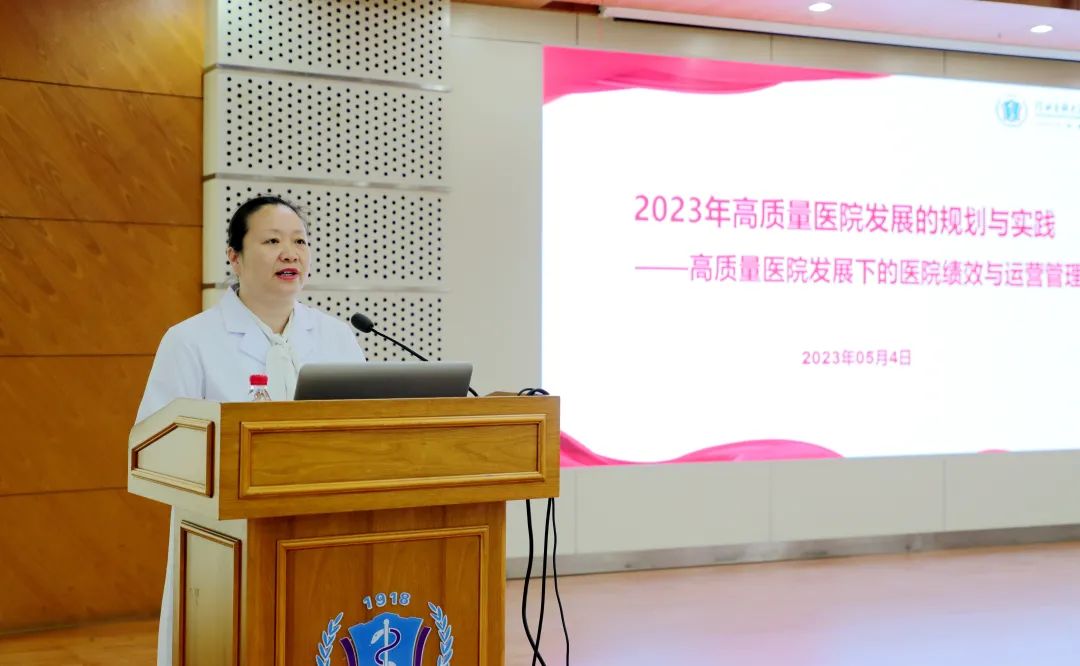 5月4日下午,我院在图书馆三楼会议室召开高质量医院发展下的绩效与运营管理主题报告会。浙江大学附属第一医院李盈教授、上海交通大学医学院附属新华医院总会计师刘雅娟教授分别作了关于病案管理和精益化管理的主题报告。副院长阎雪、耿左军、于宝海、潘文森、谷国强,全体科级干部、医疗医技科室主任、护士长、党支部书记参加会议,东院区、北院区同步视频直播。
