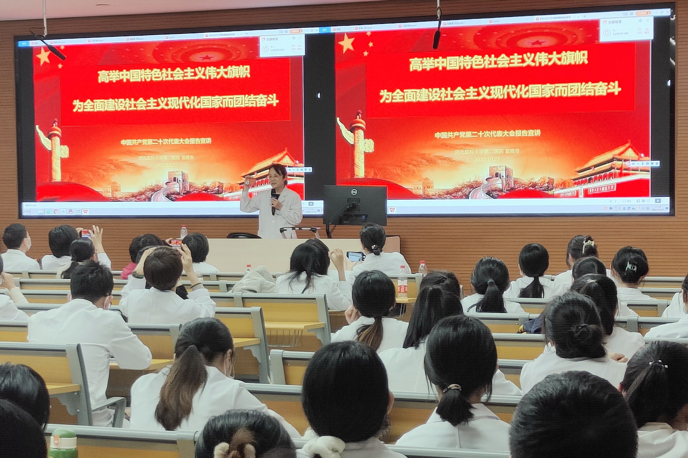 刚刚从北京载誉归来党的二十大代表袁雅冬教授,在此次病例讨论会上为老师和同学们宣讲了党的二十大精神。她寄语全院青年医师与同学们一定要将三个务必谨记在心,坚定不移跟党走,心怀梦想、脚踏实地,敢想敢为、善作善成,做有理想、敢担当、能吃苦、肯奋斗的新时代好医生。