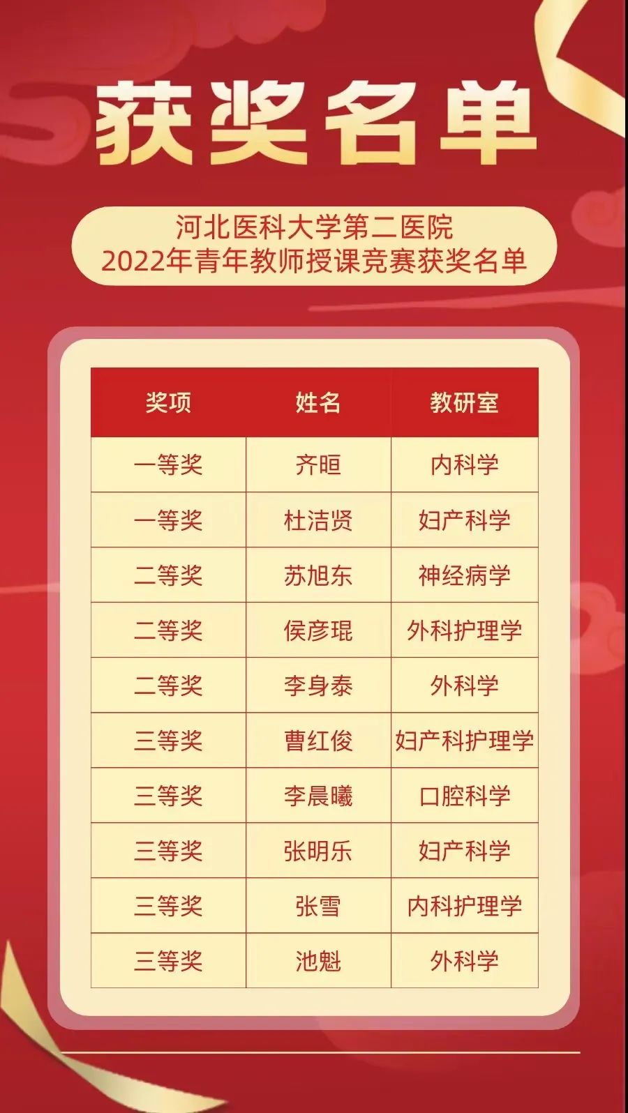 2022年青年教师授课竞赛于日前圆满结束。本次比赛由教务处举办,经过各教研室选拔和推荐,共有26名青年教师参赛。比赛采用线上线下相结合的方式进行。最终,内科学教研室齐晅、妇产科学教研室杜洁贤获得一等奖,并将代表我院参加河北医科大学第十五届青年教师授课竞赛。