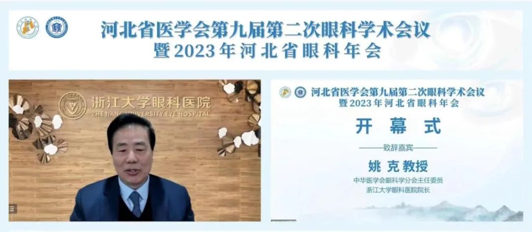 中华医学会眼科学分会主任委员、浙江大学眼科医院院长姚克教授,我院党委书记王贵英教授,省医学会副会长兼秘书长王振显教授分别为大会致开幕词。大会主席由省医学会眼科学分会主任委员、我院眼科主任刘丹岩教授担任,省医学会眼科学分会候任主任委员、河北省人民医院贾志旸教授主持会议。