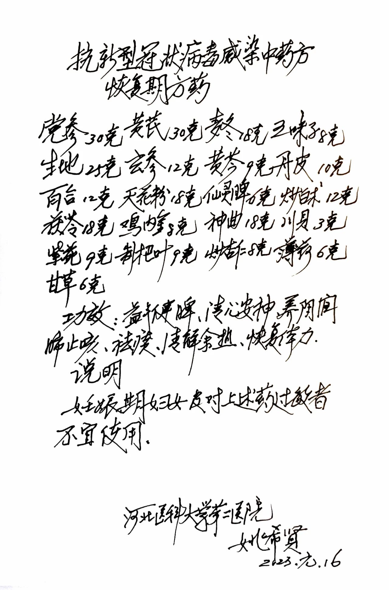 针对以上情况,国医大师、河北医科大学第二医院姚希贤教授结合本期病情的特点,开具了可用于新冠感染后恢复期的中药处方。