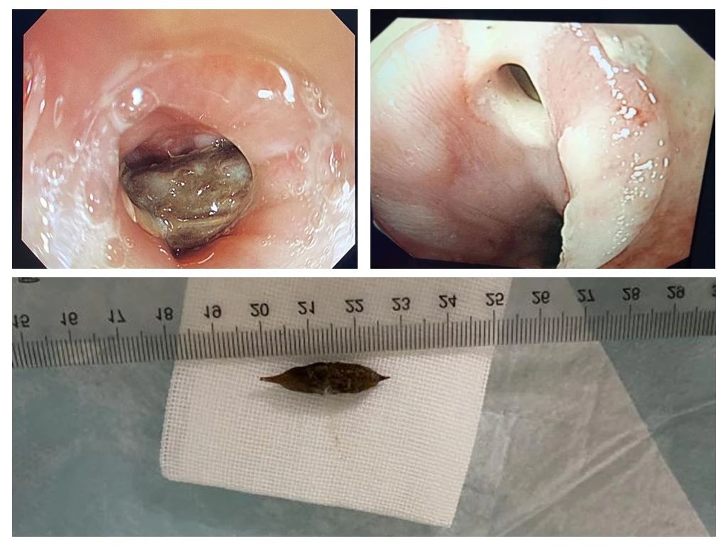 据东院区消化内科副主任医师霍晓霞介绍,当时已是傍晚六点多钟,她们忙碌完一天内镜室工作后,正准备下班。接到科主任张晓岚的电话通知后,她和内镜室护士长时晓冬、护士都贤快速准备好异物取出相关设备、器械。患者到医院后,精神倦怠,心电图显示快速房颤,动脉血气血氧分压58mmHg。综合患者高龄体弱,合并心律失常、快速房颤、I型呼衰等情况,决定立即开展床旁内镜取异物手术。术中,发现一枚长约2cm枣核崁顿于食管入口,食管前壁崁顿处已穿孔,气泡溢出。她们配合默契,仅用时3秒就将枣核取出,患者被压迫的呼吸慢慢缓解,涨红的脸色一点点平复。家属感动地哭了,连连称谢:“你们水平太高了,真是太感谢了!”