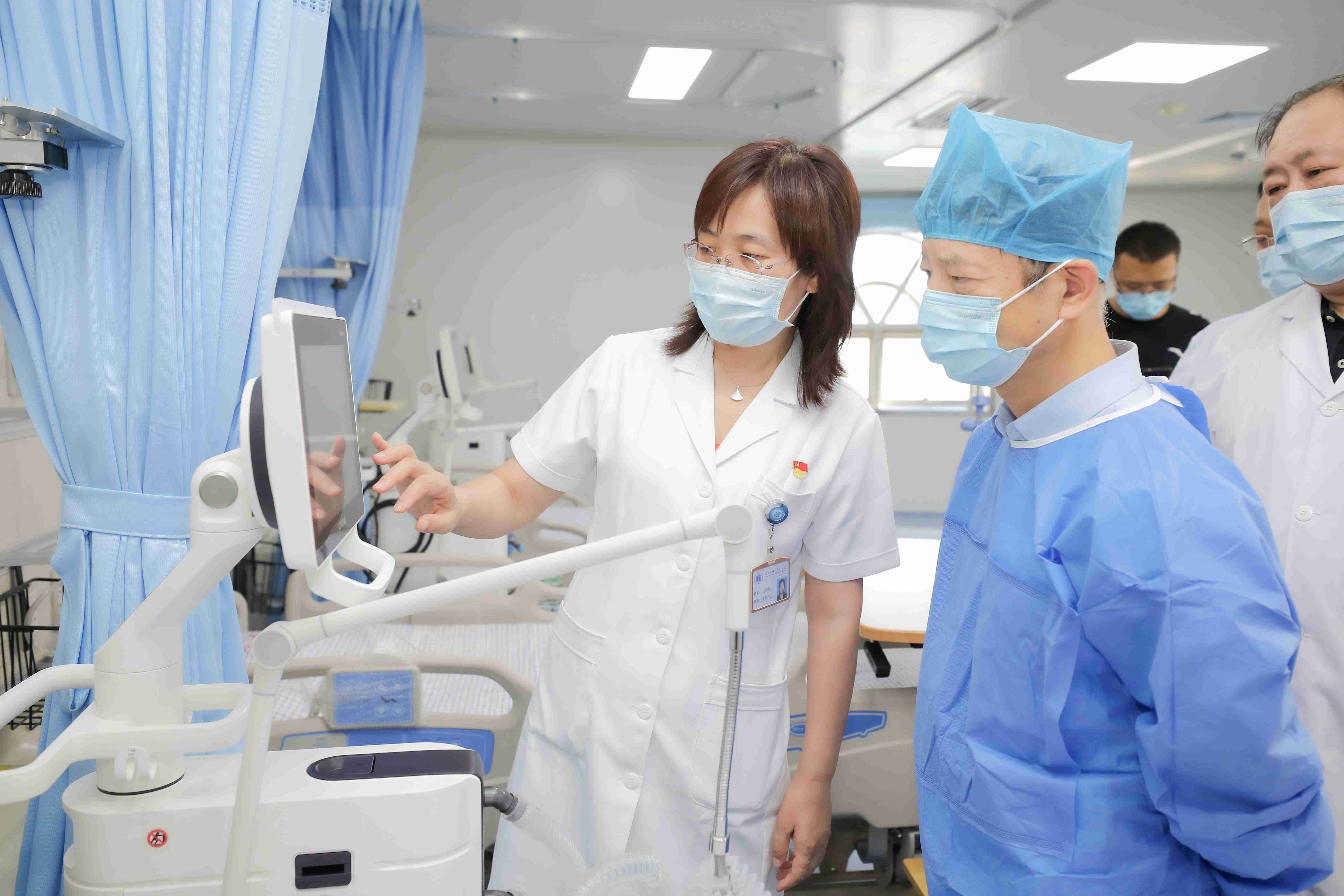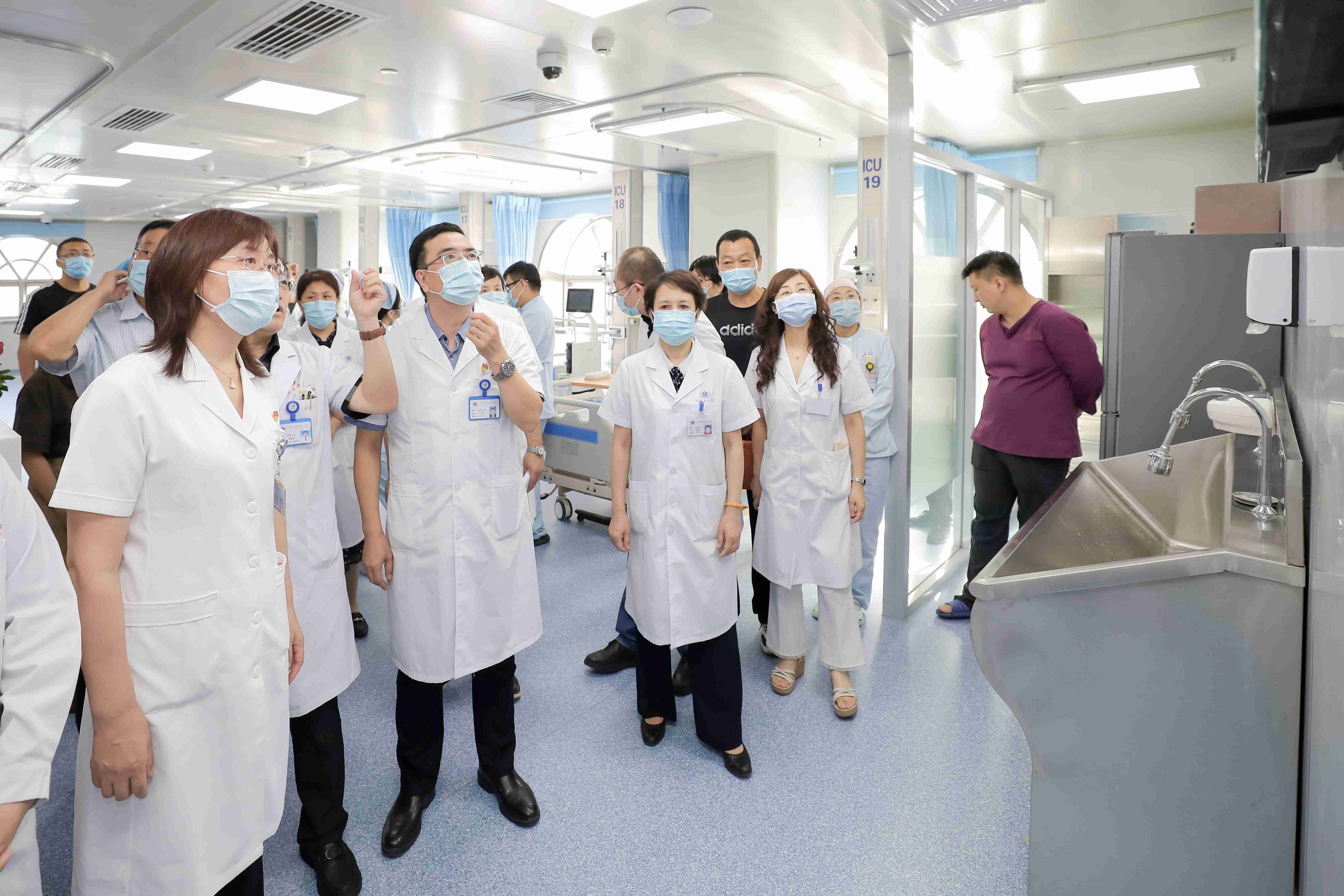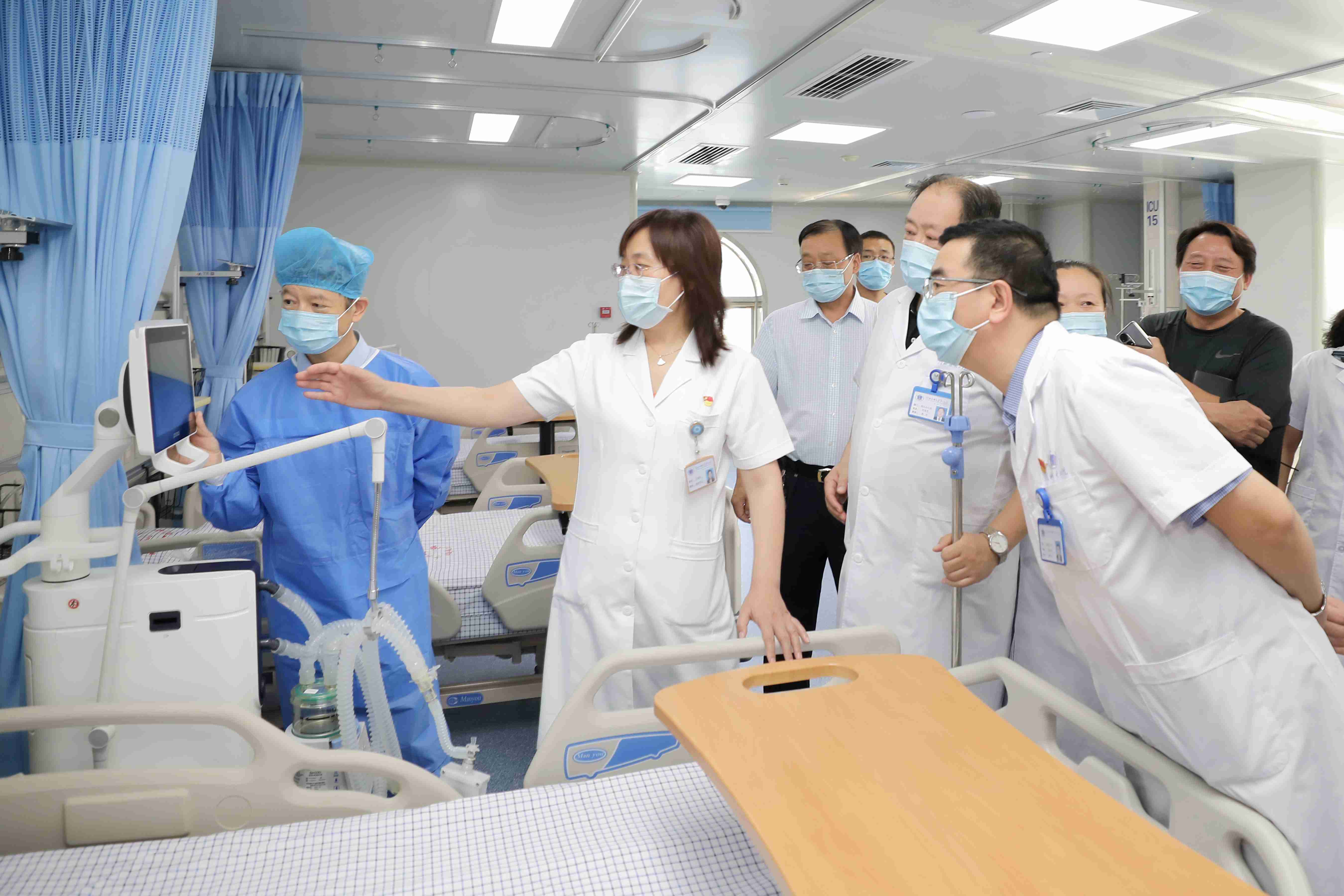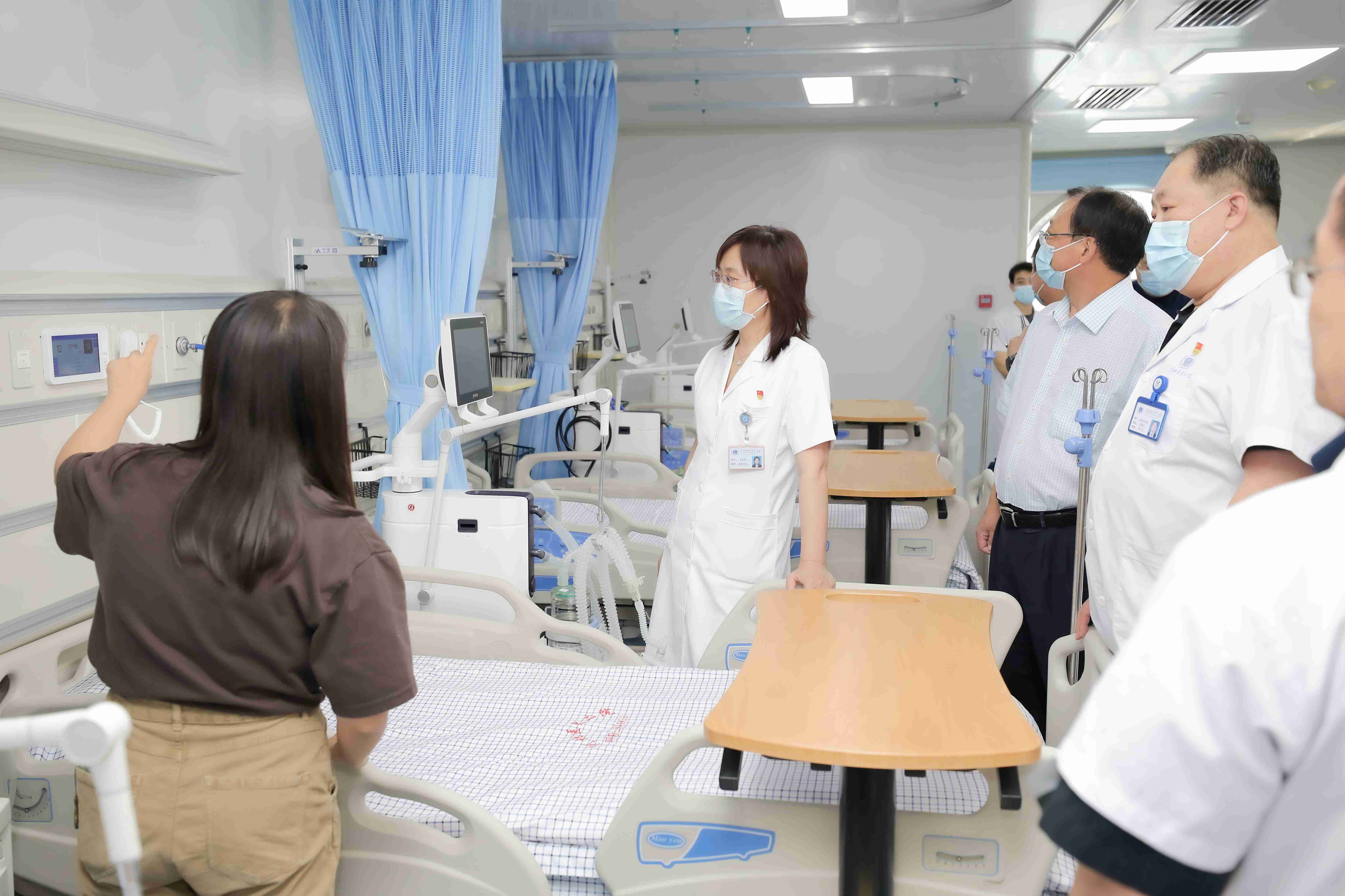 院领导首先参观了呼吸与危重症医学一科新建成的ICU病房。该病房投资300万元,设置ICU病床10张,使用了有创无创兼容呼吸机等国产高端设备,能够对重症呼吸病人进行及时有效的救治。该病房首次使用了设备功能柱,既满足了功能需要,又最大化利用了空间。
