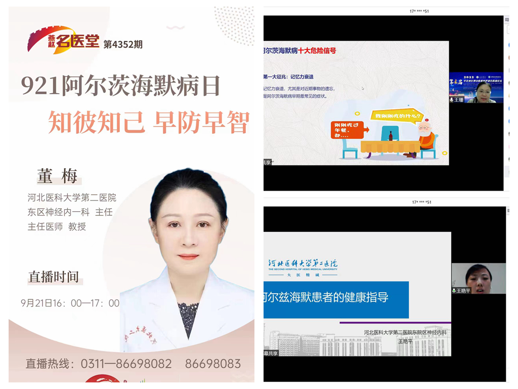 我院董梅主任及王珊主任积极参加国家卫生健康委能力建设和继续教育中心发起的大型线上义诊活动。通过询问病史,提问等方式对咨询的患者进行逐步的认知功能检查,根据病情给予相关治疗意见及相关疾病的防治知识。此外,董梅主任还参加了燕赵名医讲堂栏目,向广大观众讲解阿尔茨海默病及其危害,深入浅出地解释了认知障碍及其危害,如何尽早的发现认知障碍,做到早诊早治。