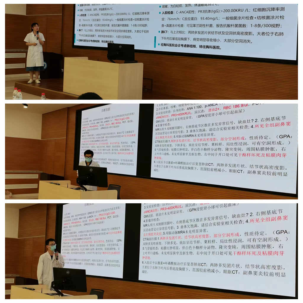 本次讨论由风湿免疫科郭惠芳教授主持,主题为“身还未好,眼已模糊—肉芽肿性多血管炎合并肺结核一例”。2021级风湿免疫科专硕研究生马镜涵同学汇报病例,住培医师针对病例提前查阅文献资料,分组针对病例的诊断和鉴别诊断进行热烈讨论,郭惠芳老师对住培医师的发言做进一步的点评分析。指导老师齐晅在病例特点、诊断及鉴别诊断等方面通过思维导图的方式帮助住培医师进一步梳理诊疗思路。彭晨星老师进行了系统性血管炎分类及ANCA相关性血管炎诊断和治疗方面知识拓展,使同学们对血管炎有了更深入的了解。