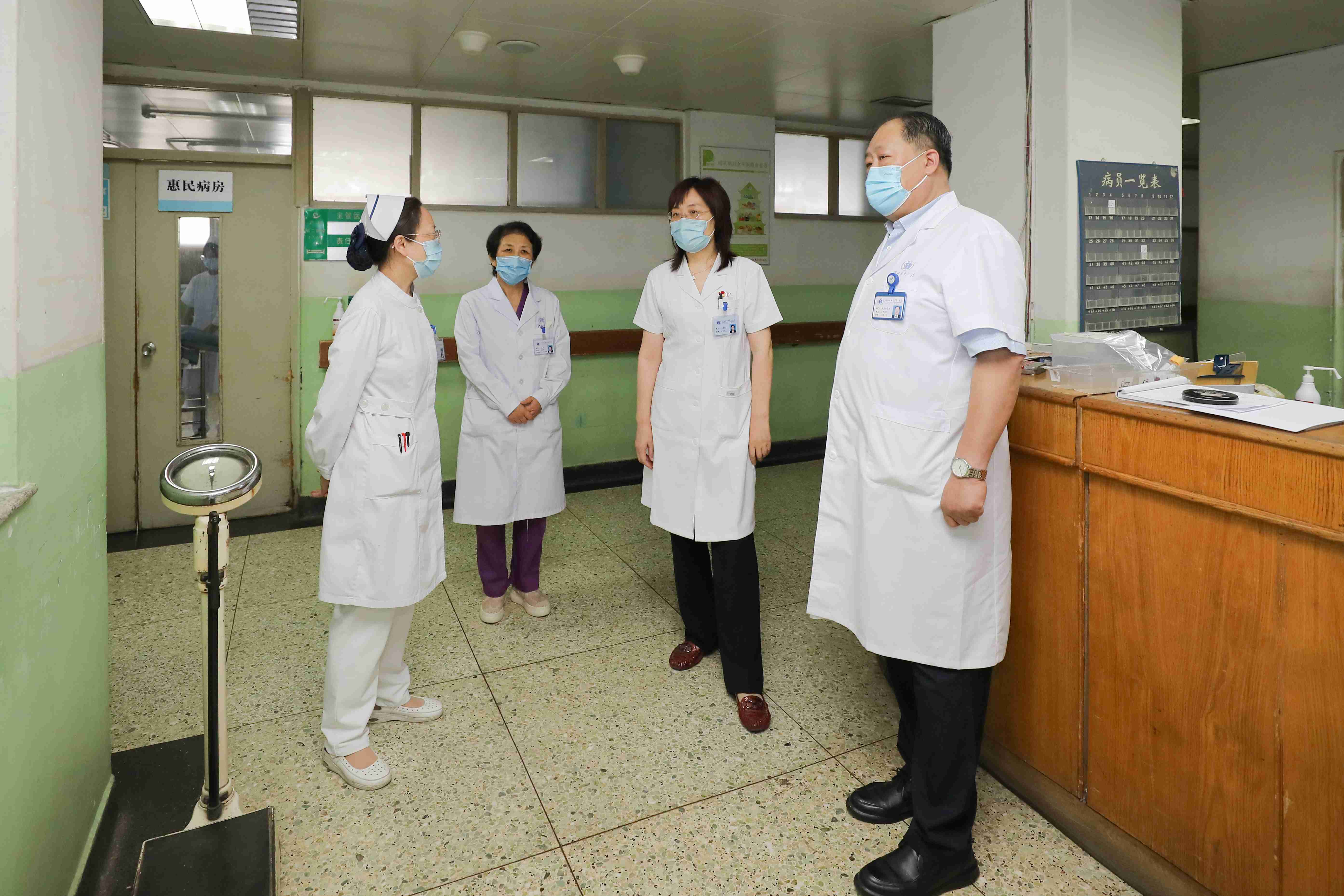 7月27日早7点50分,党委书记王贵英,党委副书记、院长时保军,党委副书记、纪委书记乔治斌,党委委员、副院长阎雪,党委委员梁韵佳和党办室、院办室、医务处、信息中心等部门在妇科、产科病区参加查房。
