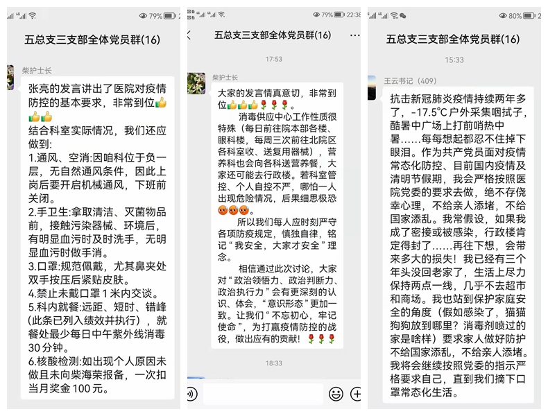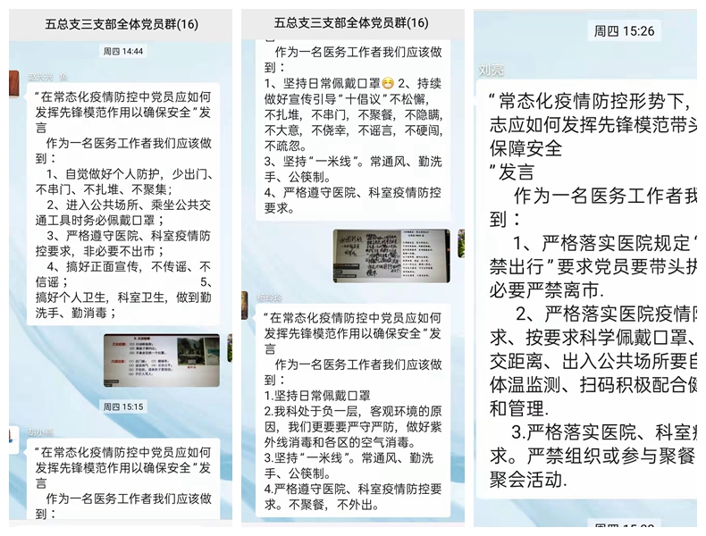 面对当前疫情防控形势,为统一思想、坚定信心、坚持不懈地做好疫情防控各项工作,3月31日至4月1日,第五党总支第三党支部在支部党员微信群中围绕“扬正气、做模范”,开展了“我是党员我带头,防控疫情当先锋”的主题党日活动。