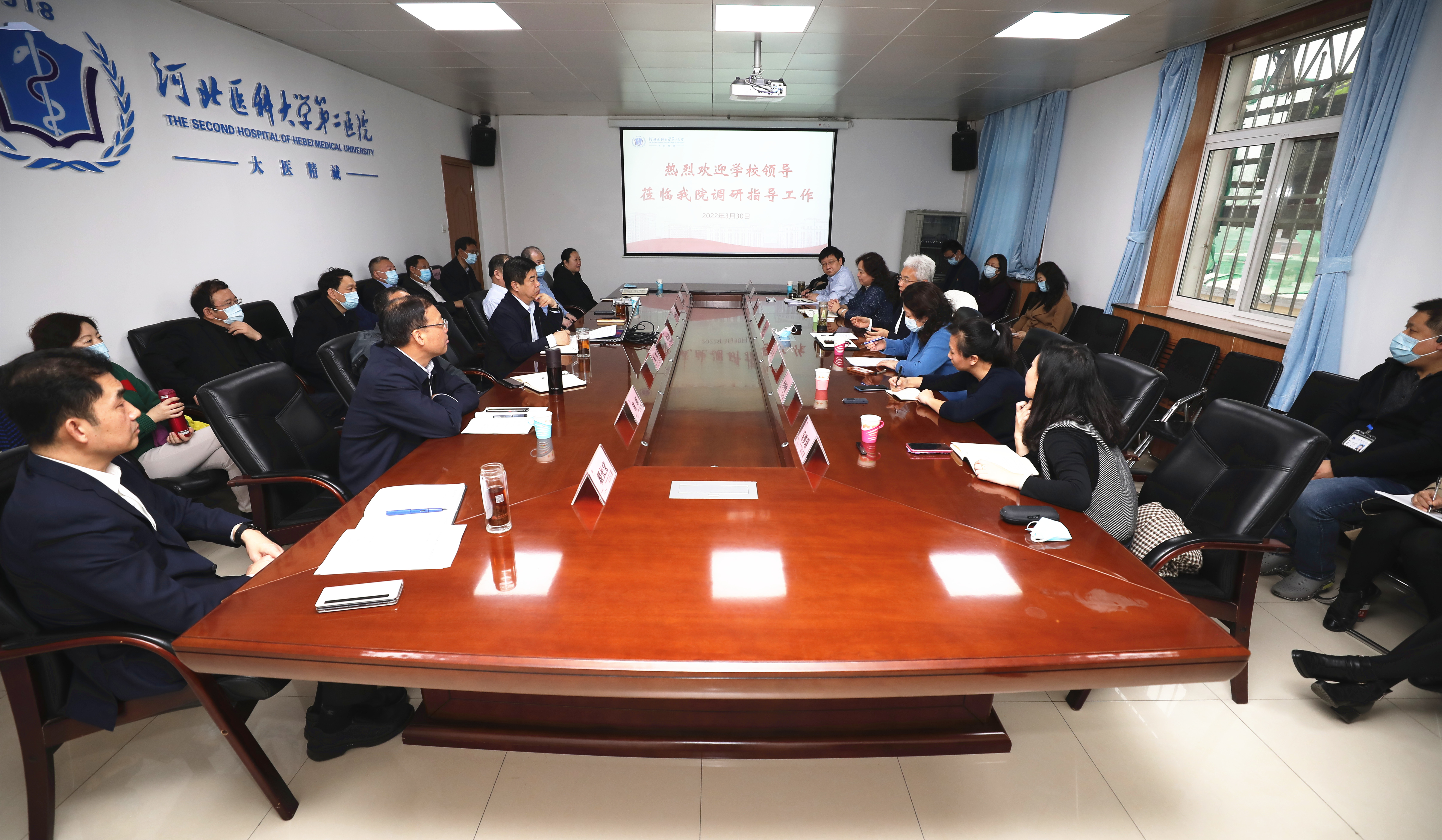 王宝山校长首先代表学校向我院奔赴省内各地抗疫的医护人员、干部职工表示诚挚慰问和衷心感谢,对医院各项工作取得的成绩给予充分肯定,并就医院高质量发展问题提出要求,做出部署。王宝山校长指出,各直属医院是医大的重要组成部分,推进直属医院高质量发展,是落实学校“十四五”发展规划、加快特色鲜明高水平医科大学建设步伐的重要内容,也是贯彻王东峰同志在听取九届省委第十轮巡视、巡视“回头看”情况汇报时的讲话精神、全面推进省委巡视反馈意见整改落实的重要举措,医院要切实做到“以人民为中心”,高度重视人才队伍建设和学科建设,不断提升医院管理水平,改善人民群众的就医体验,提升患者就医幸福感、获得感。学校将认真梳理医院提出的意见建议,深入研究第二医院遇到的困难和存在的问题,全力支持医院发展,为促进医院高质量发展、建设“健康中国 健康河北”提供帮助支持。