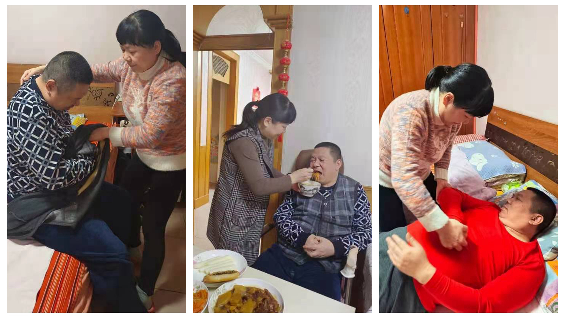为了让丈夫身体快速好起来,多年来,她每天给他进行全身按摩练习,睡前用热水给他擦身、洗脚,每过两三个小时,帮他翻一次身,久而久之她患上了腰椎间盘突出症,疼痛难忍,但为了丈夫她依然咬牙坚持。