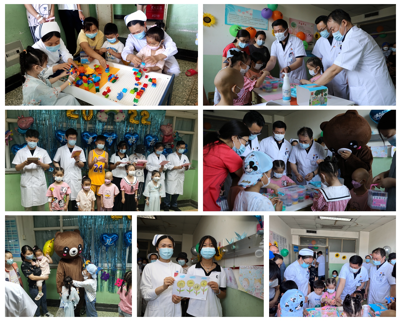 为了能让生病住院的小朋友过一个快乐难忘的六一儿童节,医护人员很两周前就开始满怀热情的策划此次活动,大家不仅布置了温馨的病房,还准备了丰富多样的玩具和学习用品、小礼物等。活动期间,护理人员带小朋友们唱歌跳舞、做洗手操,还有一名老师家长热情参与。研究生们带领稍微大一点的小朋友进行了诗歌朗诵,朝气蓬勃的气氛感染了整个病房。还有护理人员装扮成可爱的大熊与孩子们互动、拍照。之后还有折纸、彩泥、乐高、钓鱼等诸多小游戏环节,小儿外科病房在这一天充满了喜气洋洋、欢声笑语。活动结束,赵宪国书记和仲智勇支部班子成员为参加活动的孩子们和暂时不能下床活动的孩子们都送上了精心准备的小礼物。活动不仅让患儿家属体会到医护人员的用心,拉进了医患关系,更加体现了优质护理的涵义,促进了小朋友们的心理健康。让孩子们感受到医院不是冷冰冰的病房,而是充满了关怀与爱心,帮助他们快速康复、促进健康的场所。