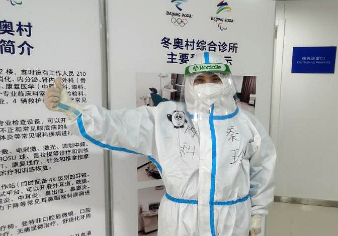 每次我和柴茜楠大夫出诊时,都会在防护服上手绘冰墩墩,这不仅体现出医学人文关怀,拉近和患者之间的距离,同时这也成了综合诊所一道靓丽的风景线。虽然在就诊过程中,我们戴着防护面屏和口罩,但我们始终保持微笑。我们用温和的语言,精湛的技术,使所有来冬奥村综合诊所就诊的患者都感受到温暖和信任。我们是爱的传递者,展现的不仅是二院风采,同时也是中国风采。