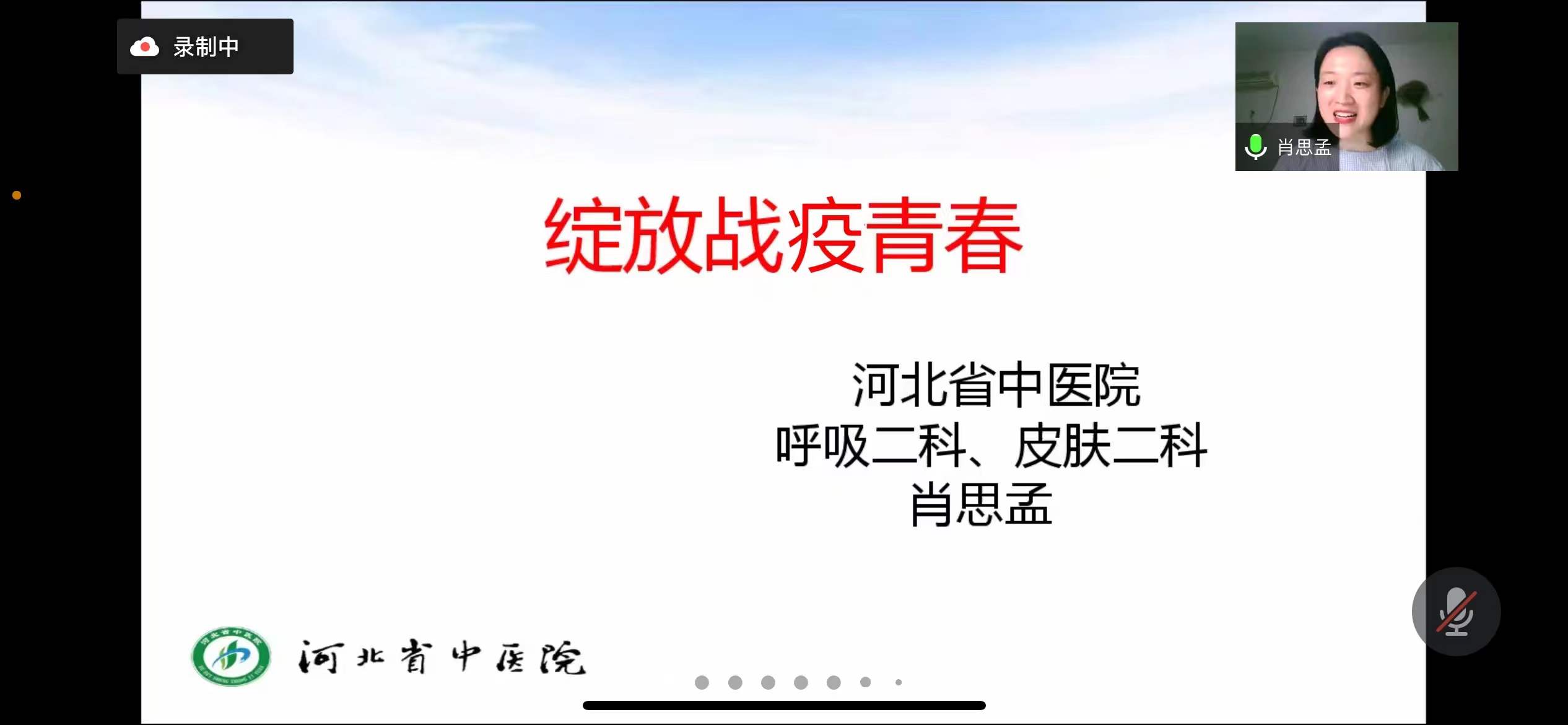 3月25日,第24届“中国青年五四奖章”获得者、2020年全国卫生健康系统新冠肺炎疫情防控工作先进个人、河北省中医院呼吸二科、皮肤科副护士长肖思孟与第八党总支部第三党支部全体学生党员、积极分子以及护理、助产学专业2018级全体同学齐聚云端,分享抗疫故事,激发时代新人青春担当。2018级护理、助产名誉班主任、科研处处长赵滨、第八党总支部书记韩志敏聆听了这堂鲜活、感人、有温度、有力量的思政课。第三党支部书记郑雅梅主持。