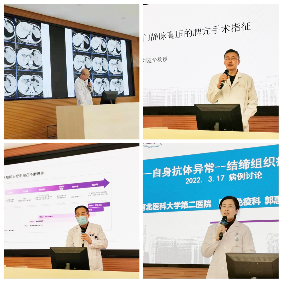 特邀点评专家由医学影像科冯平勇教授、肝胆外科刘建华教授、血液内科任金海教授、风湿免疫科郭惠芳教授针对本次病例讨论做先后发言。冯平勇教授对肝硬化门静脉高压影像学特点及患者行TIPS术及脾栓塞术后腹部增强CT图像做了详细的讲解;刘建华教授重点介绍了肝硬化门静脉高压的脾功能亢进手术指征,特别强调脾亢是机体对门静脉高压的一种代偿措施,轻易切脾会打破机体平衡;血液内科任金海教授考虑患者为免疫性血小板减少症,并进一步针对免疫性血小板减少症的概念、近年来认识及指南更新方面进行了详细阐述;郭惠芳教授结合该患者具体免疫学异常,主要从是否存在结缔组织病、如何看待患者的自身抗体及血小板减少原因等三个方面进行详细分析。通过以上专家从各自专业的角度对该病例进行的深入讲解及分析,同学们收益颇丰。