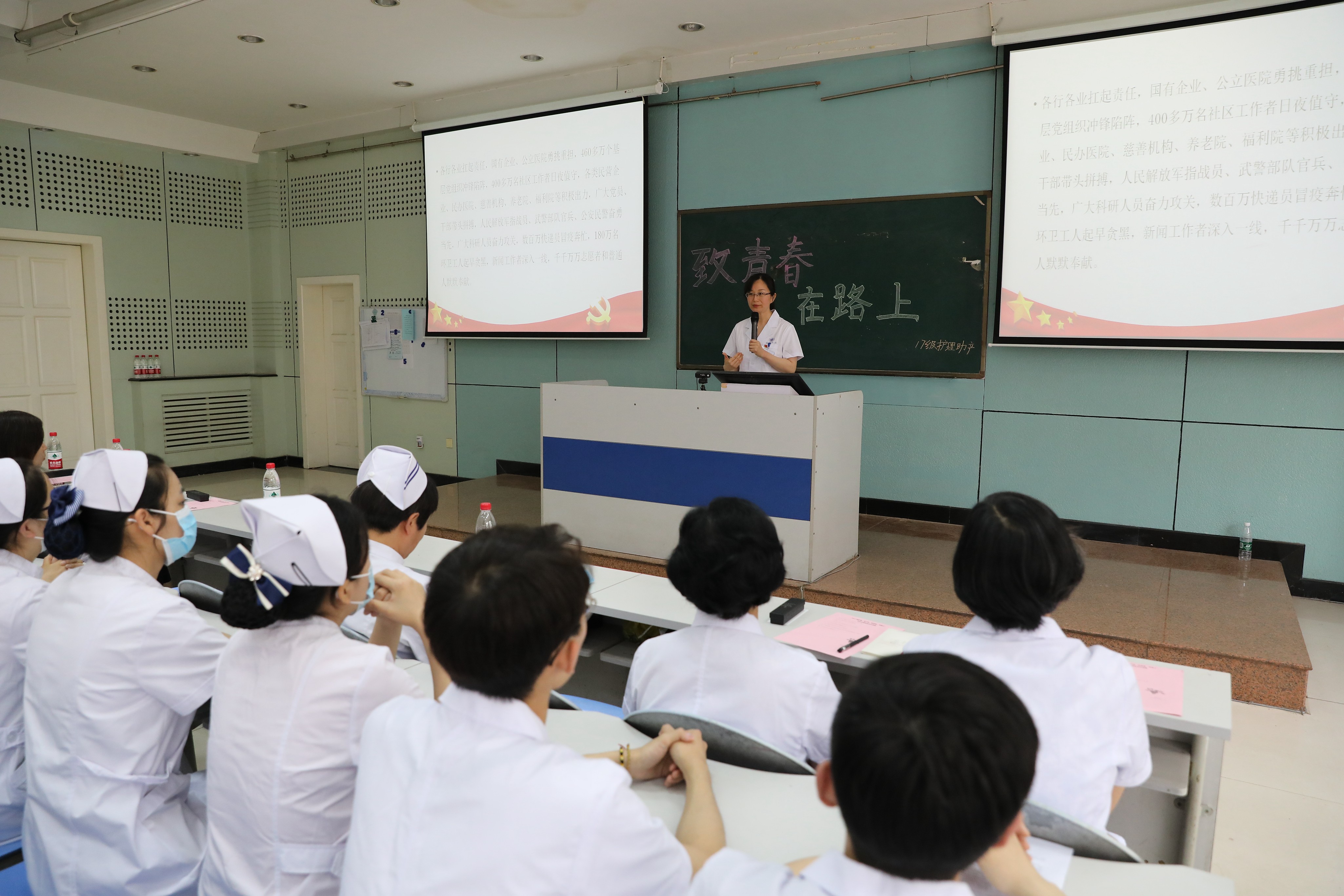 6月7日护理、助产专业2017级“致青春、在路上”毕业主题班会在教学楼一阶梯教室举行。名誉班主任、学校护理学院副院长、医院科研处处长赵滨老师;学业导师、内科护理学教研室主任,大内科护士长何文英老师以及教务处领导老师们参加了本次主题班会。