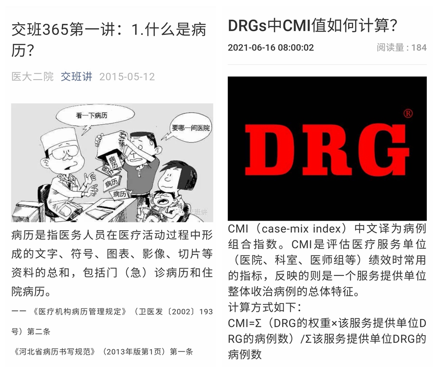 微信公众号“交班讲”从2015年5月12日正式发布第一讲《什么是病历》至今天《DRGs中CMI值如何计算?》已经过去了6个春秋寒暑,关注读者达12274人,遍及全国各地。在每天的早交班之后,利用2-3分钟的时间学习“交班讲”的内容早已经成为了我院员工的工作习惯,深受科室管理者及医务人员的喜爱和好评。