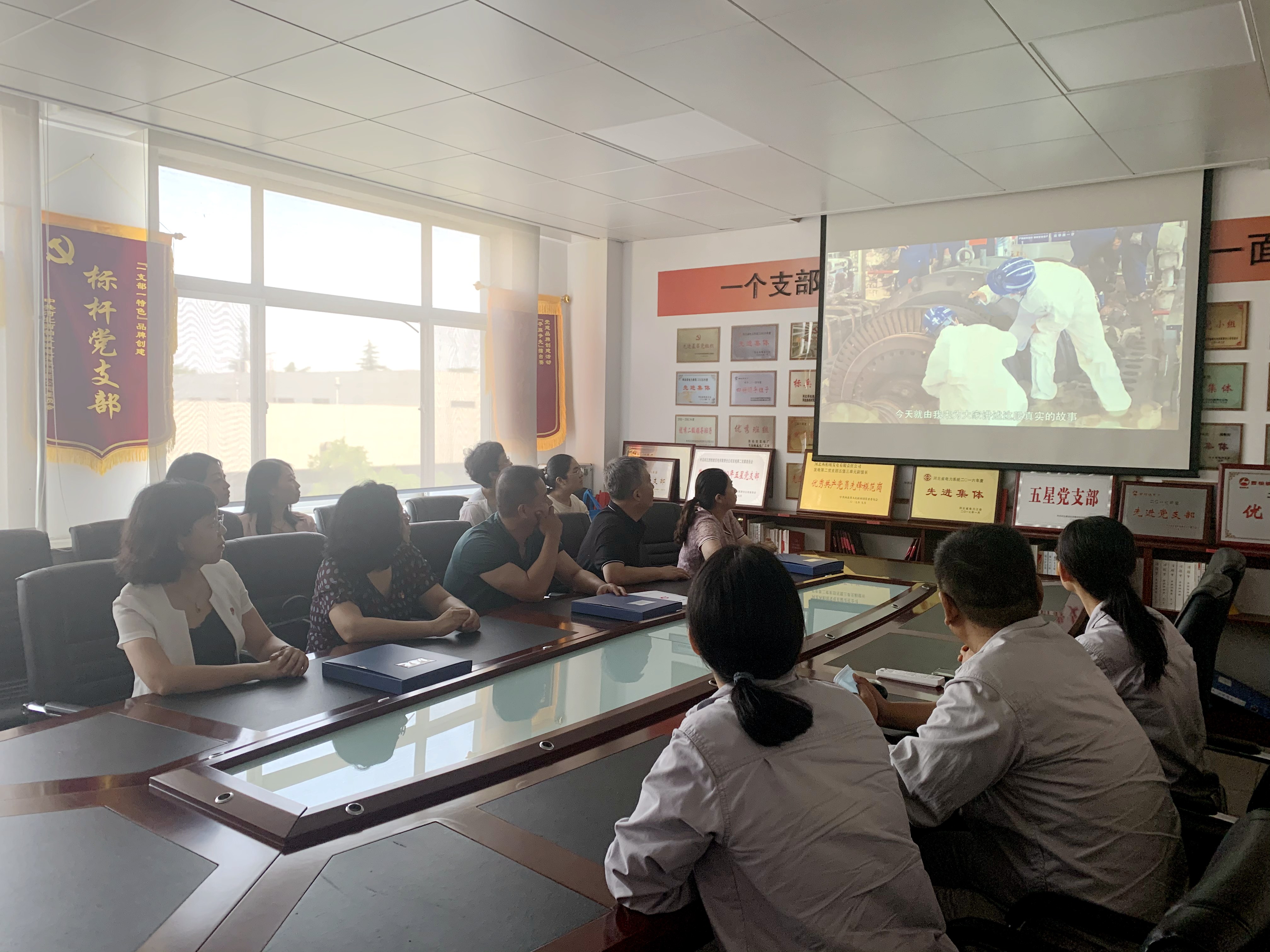 科普讲座后,同志们来到发电党总支部观摩活动阵地并座谈交流。发电党总支是我省国资企业党建工作的标杆,党总支活动园地虽然空间有限,但是布局井然,墙壁上不仅有入党誓词,三会一课等制度,还有各党支部介绍,党员先锋事迹,众多奖状更是排列有序,图书角各种党史党建学习材料整齐排放,给更好的开展党建工作提供了场地保障。发电党总支部副书记霍学军介绍了发电党总支基本情况。双方党员同志们共同观看了《光明使者绽芳华》——抗疫女工在行动专题片、公司红歌等视频,交流了党建工作及党史学习教育开展情况,起到了互学互鉴作用。