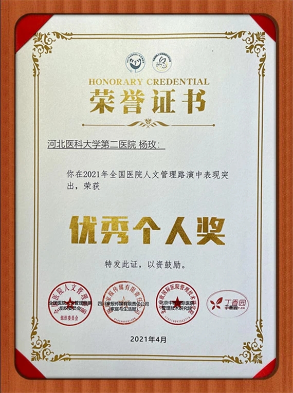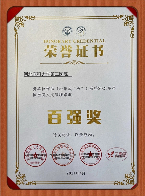 4月27-30日,由中国生命关怀协会医院人文建设专委会等部门主办,中国白求恩精神研究会、中国医院品质管理联盟、四川省卫生健康宣传教育中心、丁香园协办的中国医院人文管理萤火虫计划暨2021年全国医院人文管理路演在成都举行,来自全国各地的两百多家医疗机构近六百位优秀代表齐聚美丽天府,共襄盛举。我院医学人文中心和宣传部合作创作的《心事成“石”》,经过评委会初选、网络展示、专业评委评审打分比选等环节,从全国各地500多个作品中脱颖而出,荣获“年度人文管理百强奖”,宣传部副部长杨玫获得“人文管理优秀个人奖”。